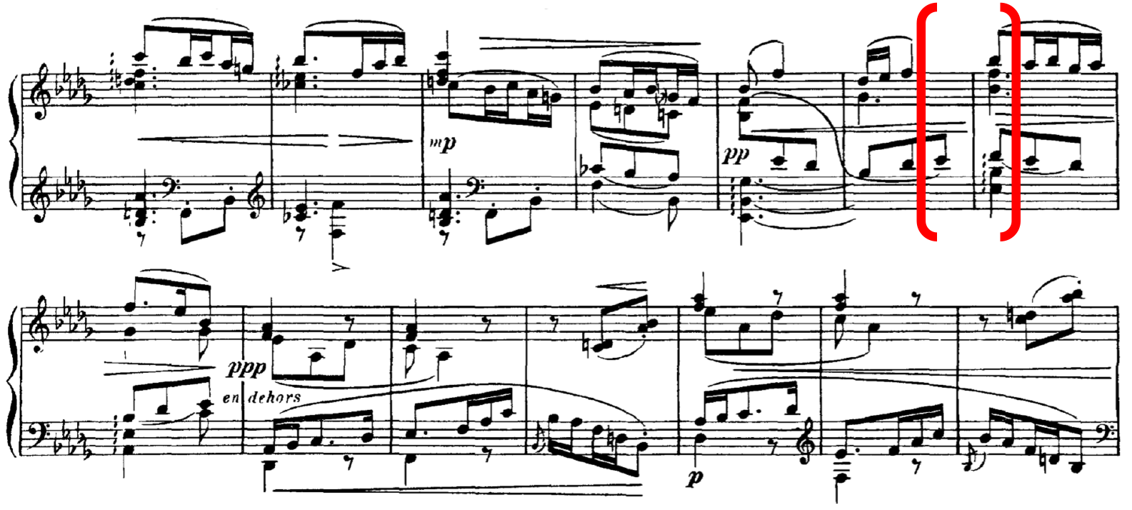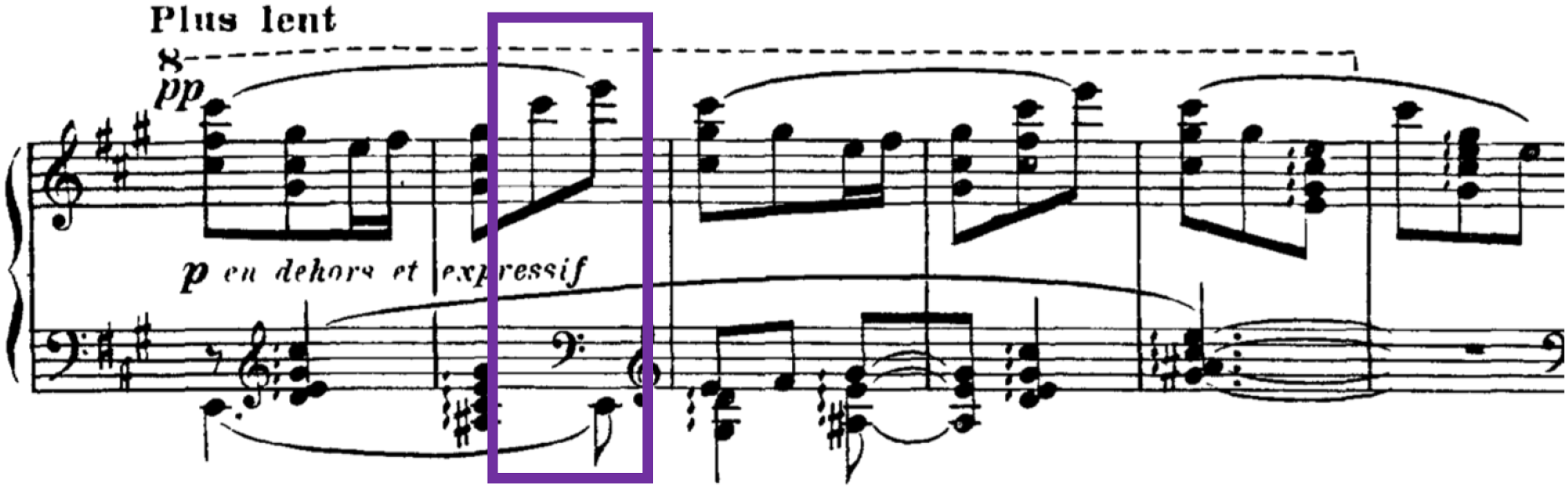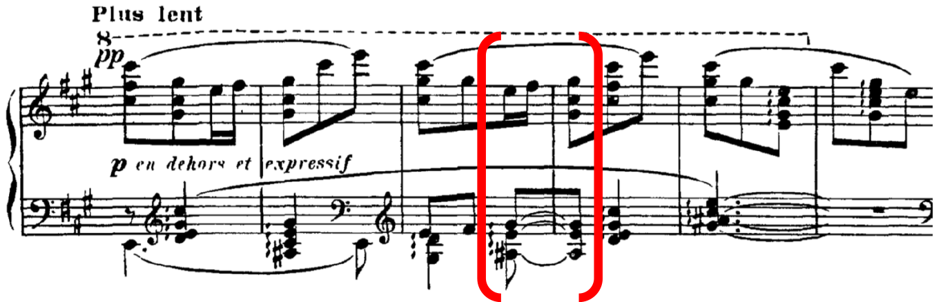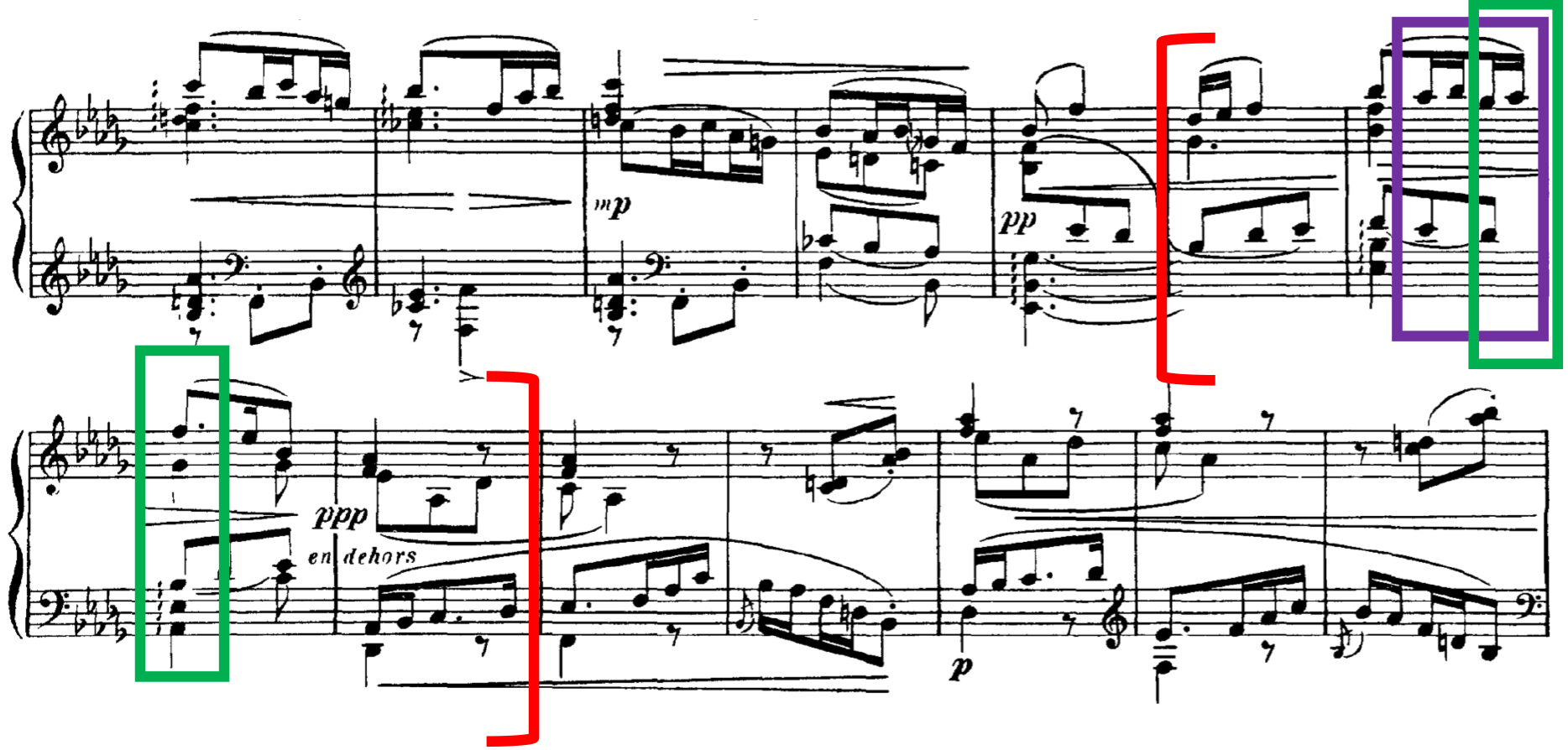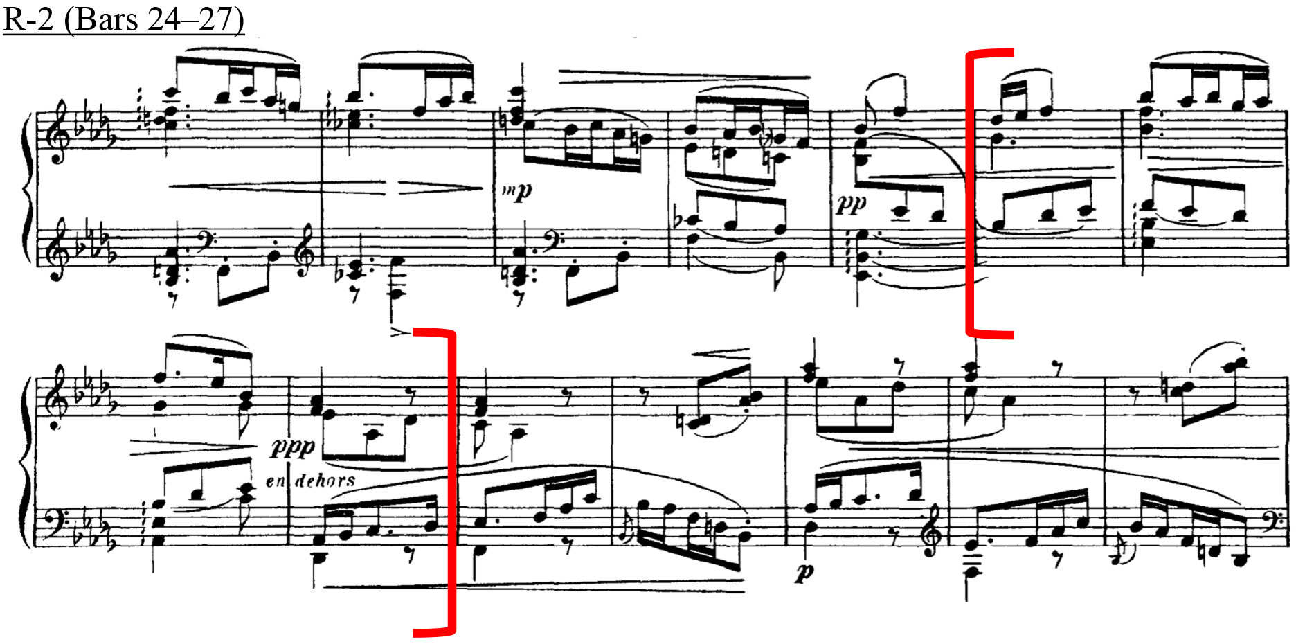 Similarly, with R-3-6, which also contains a small tension rating value, this is supported by a large value from the model, AVL 13, and this also marks a shift from a PCn containing four notes in a chord to a single note. At this point in the music, R-3-6 coincides with the end of the two-bar figure, where both treble and bass arrive on E. This highlights the importance of the slur marking in bar 40, to phrase off that particular moment. Therefore, in this instance, the lower tension rating value perceived by listeners can be accounted for in conjunction with other surrounding musical parameters. 24