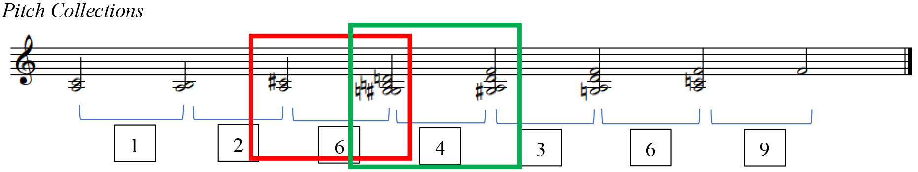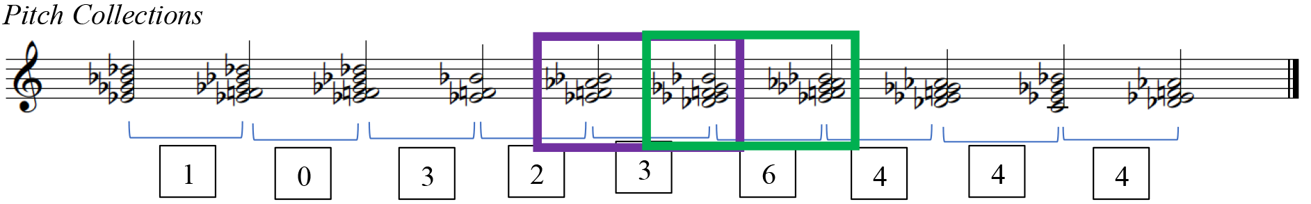 Figures 1, containing the third Hindemith excerpt, exemplifies how meaningful segmentation 23 occurs and Figure 2 lays out these segments as pitch collections into a separate stave for voice-leading analysis. The numbered segments in Figure 1 correspond with the PCns in Figure 2 and the brackets under the PCns in Figure 2 denote the smaller segments, the sound clips.