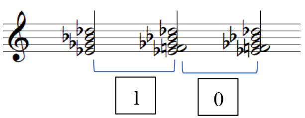 For instance, when examining the transformation from G minor [7X2] into F minor [580] in Figure 42, which are the first two key areas in the Sonata (measures 1 and 41 respectively), one can observe their numerical proximity and how they progress diagonally in their integer space. 42 The movement between individual voices from G to F minor self-evidently moves by 2, as further explained in Table 4. In this instance, the total amount of VL movement from the accumulation of the individual VL movement is therefore 6. As such, one way to quantify the movement between two chords or pitch collections (PCns) and to describe the transformation would be to measure or calculate the total amount of harmonic movement rather than using "specific labels" for the transformations (e.g. parallel, relative, leading-tone), an idea influenced by Straus's work, which attempts to generalize voice-leading systems. 43