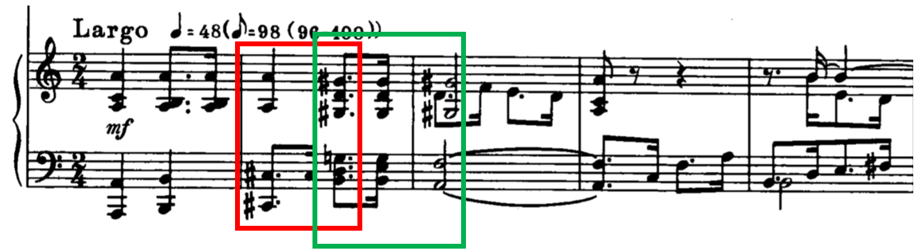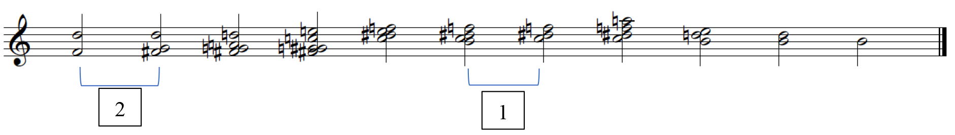 Additionally, Bigand, Parncutt and Lerdahl's (1996) studies revealed the effects of interval size between successive chords on the perception of tension, where interval size is particularly significant for the movement within outer voices – where the larger the interval was in each voice, the greater the perceived tension. This is however context dependent, as their hypothesis states that an event, which is preceded by a large interval is perceived as less stable than an event which is preceded by a smaller interval. 7 Their studies (Bigand, Parncutt, Lerdahl, 1996; Bigand & Parncutt,1999) also focus on the internal and external influences (by utilizing short and long chord sequences as the stimuli set) to better account for perceived tension through a cognitive approach (echoing the works of Lerdahl and Krumhansl) and applying a sensory model, examining the roughness and dissonance of individual chords. 8 Their results reported that the examination of horizontal tension and its roughness will better account for musical tension and chords that contain high roughness values are perceived to be more tense. 9 However, one limitation from these two studies is the emphasis on analyzing chords within a strictly tonal context. As such, this could be further developed into a study that examines tension in harmonies that do not have to be related back to a specific tonality and the tension of these chords will be assessed at face value.