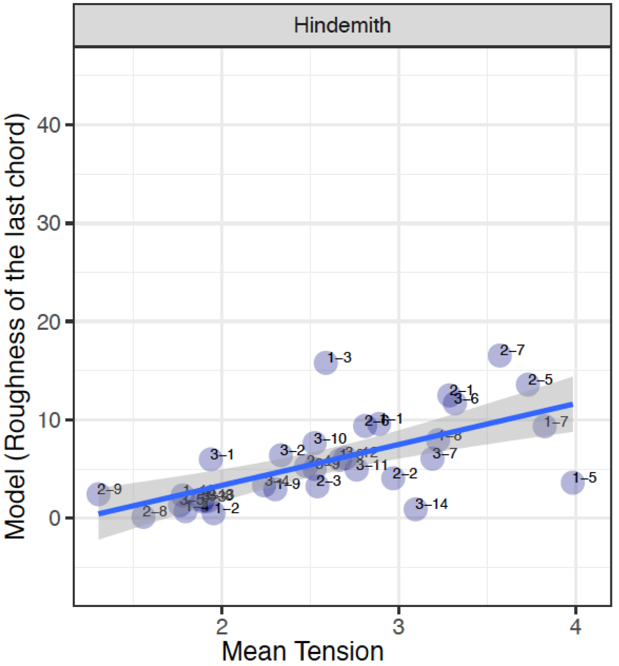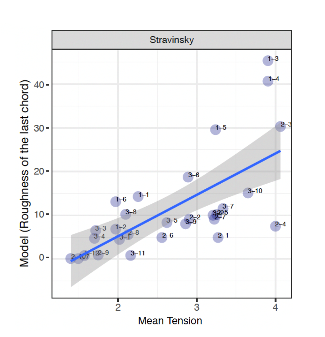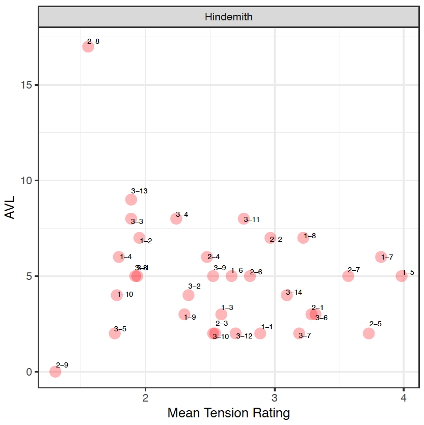When comparing the mean tension rating (MTR) to the aggregated voice-leading values (AVL) in the Hindemith excerpts, the results firstly reveals that larger values from the model does not necessarily mean more tension, (as there is no correlation between the ratings and the model, r[31]= -0.227, p=0.2028), but it does act as a prompt to invite the analyst to re-examine the particular moment in the music. For example, sound clips H-2-8 and H-2-9 have been identified by participants as a small MTR, between 1 and 2. The model indicates that H-2-8 is supported with AVL17, so despite the large value, the smaller tension rating in fact coincides with a movement from a "cluster" chord to a unison note. And whilst H-2-9 is supported with AVL0 from the model, correlating closely with the results from the study, it actually represents the movement between two identical notes – a unison – which suggests that listeners associate movement by unison with a small tension rating.