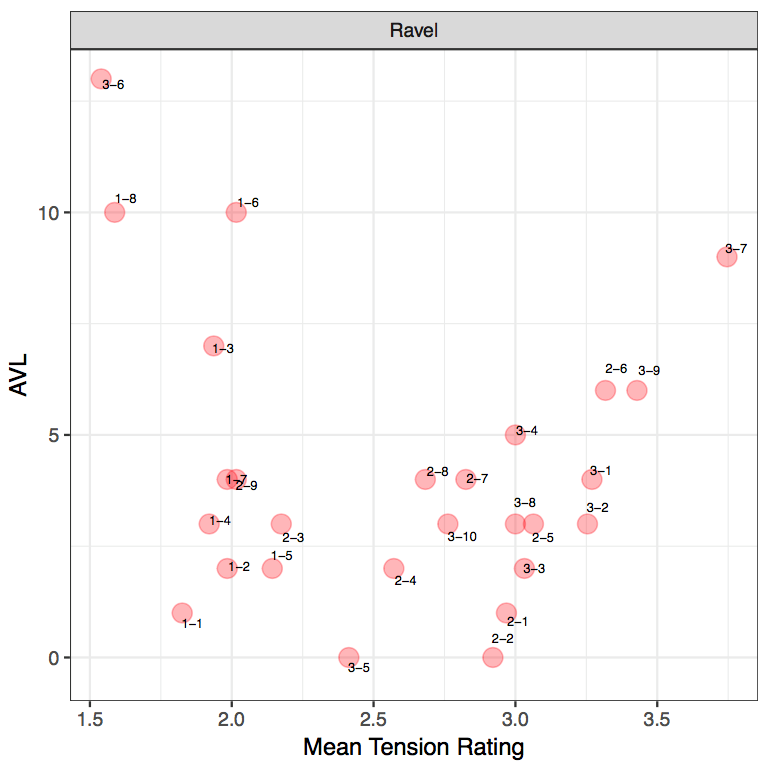 The AVL and MTR results from the Ravel excerpts reveal that there is no clear linear correlation between the AVL model and mean tension ratings (r[25]= -0.199, p= 0.3187). However, this does not mean that the pattern could not be interpreted and there might in fact be a curvilinear relationship. Firstly, R-1-8 and R-3-6 have been perceived by participants with a lower tension rating but the model indicates a large AVL value. When examining the notes in R-1-8, the large AVL movement (AVL10) identified by the model marks a shift from a PCn containing 3 notes to a single note. The direction of the first PCn to the second is also of a descent. It can also be noted that a reduced number of notes in the second PCn may have had an impact on listeners' perception as it may appear less tense. When correlating this finding back to the music, this particular moment coincides with a tied A♭ across the bar, with an absence of a bass note. Therefore, despite the large AVL value from the model contrasting the small tension rating, it simply indicates that a large AVL movement does not necessarily have to represent more tension but it marks a significant change in the harmonic contents, drawing our attention to that particular moment. In this instance, the large AVL value indicates a release of tension. Thus, whilst the model's calculation represents the physicality of the PCn's movement, its external qualities, it can be argued that the mean tension represents the culmination of other parameters, such as contour.
