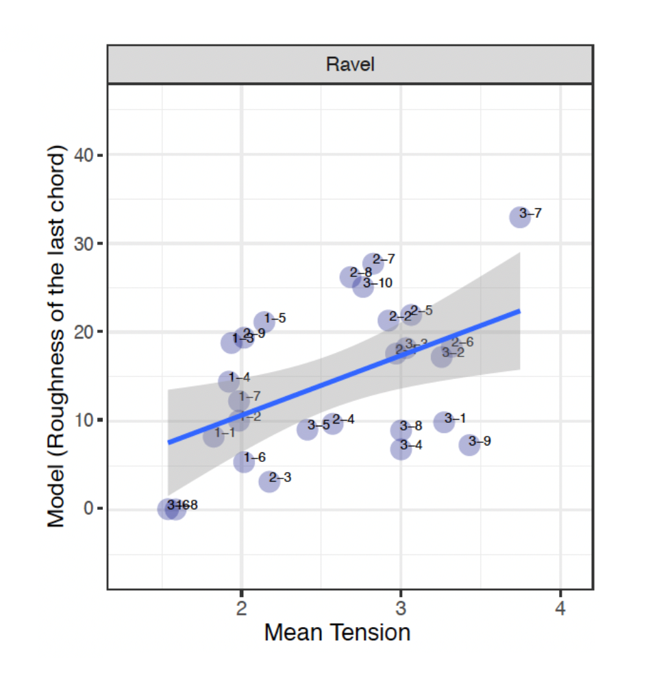 Another interesting point can be seen in the second Ravel excerpt, where there is a larger tension rating value in R-2-1 and R-2-2 despite the small value from the model. The first clip, R-2-1, comprises a movement of a semitone (1) whilst the second clip, R-2-2, retains the same pitches. The MTR values are 2.97 and 2.92 respectively. This then suggests that even if outer voice movement (especially in the soprano line) is not the primary factor in determining tension, the density of the chords plays a role in determining post-tonal tension. The presence of more pitches as well as intervallic movements of a second within the PCn could attribute to how one perceives tension. The same observation is also extended to the third excerpt in R-3-5, where the model tension value is 0 whilst the MTR is 2.41.