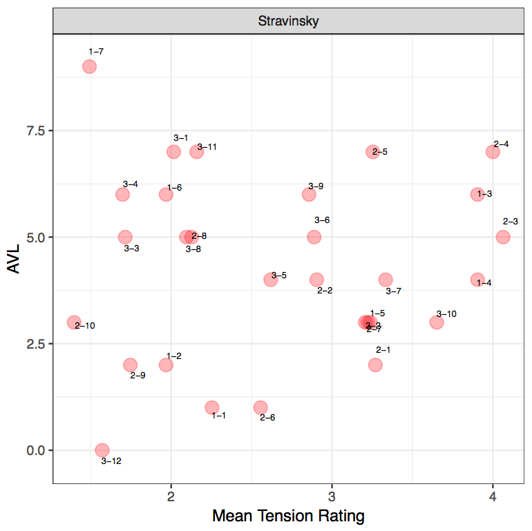 From the MTR of the Stravinsky excerpt, it can firstly be seen that S-2-10, S-3-12 and S-1-7 contain the lowest ratings from participants, implying a low amount of tension. Again, no clear pattern between AVL and mean tension ratings emerge (r[27]=0.043, p = 0.823). With the first clip, S-2-10, this is also supported by a low AVL movement from the model, AVL3. When relating this particular moment to the music, this moment coincides with the end of a phrase as well as the end of the musical idea. However, the low tension rating could also be attributed to the shift from a PCn to a single note. With R-3-12, this is supported by AVL0 from the model and it can be seen that there is a direct correlation between the model and mean tension there is no movement between the pitch collections. Interestingly, this also coincides with the start of a new phrase, which suggests that the phrase begins on a low amount of tension. And as for S-1-7, this is supported by a large value from the model, AVL9. This may be attributed to the shift from a 3-note PCn to a single note. This again exemplified how a large AVL value from the model does not necessarily have to evoke more tension, but it could represent the opposite, simply marking a pivotal moment in the music. Incidentally, when relating this back to the music, this also coincides with the start of a new phrase as well.