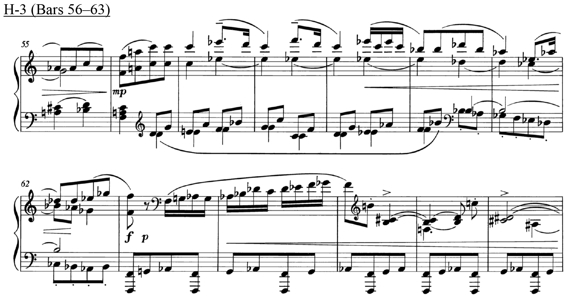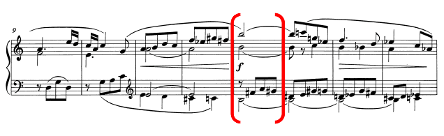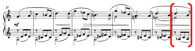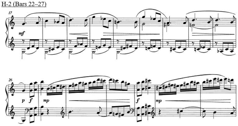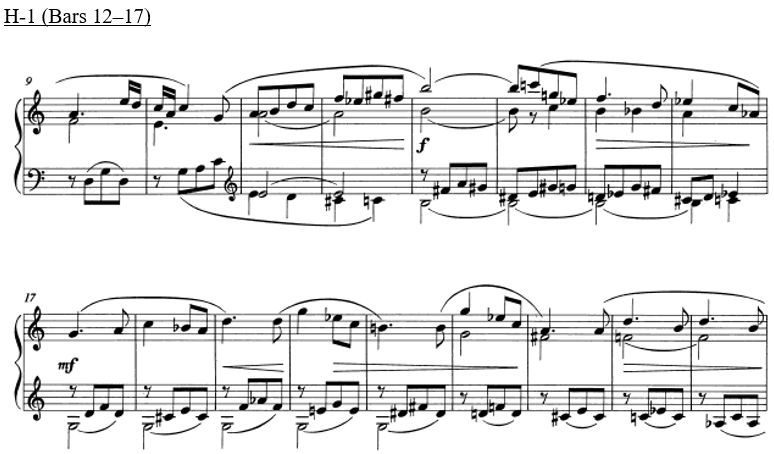 The two largest tension rating identified in all three Hindemith sound clips, H-1-5 and H-1-7, coincides with a shift from a consonant interval to a more dissonant pitch collection, which comprises of more than one layer of consecutive semitonal movement (e.g. H-1-7 contains a movement of B♭ to B and F to G). An interesting point that arises from this observation is that when putting this back in context with the music, the results align with the climactic moment of the phrase (bars 15–16), where there is a driving quaver pattern in the LH against the descending melody of the RH, played forte. This reinforces the relationship between the musical contour (examining the melody, dynamics and rhythm) and the harmonic contents.