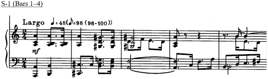 In this excerpt, four clips have been identified by participants as containing a higher tension rating value: S-2-4, S-2-3, S-1-3 and S-1-4. With the first excerpt, S-1-3 and S-1-4 are supported by AVL6 and 4 respectively from the model. Within its individual movements, S-1-3 contains a shift from a sound that can be described as containing "consonant" qualities to a more dissonant sound, where there is a "clash" between G♯ and G. S-1-4 contains a movement of two consecutive dissonant sonorities. With the second excerpt, S-2-3 and S-2-4 are supported by AVL 5 and 7 respectively from the model. Both sound clips contain PCns that can be described as dissonant due to the presence of stacked second intervals. These two sound clips also demonstrate that despite the small movement in the soprano voice, listeners can hear the dissonance in the inner voices, which resulted in the high-tension rating. This could therefore suggest that register and small voice-leading movement in the soprano voice may not be a primary factor in determining post-tonal tension.