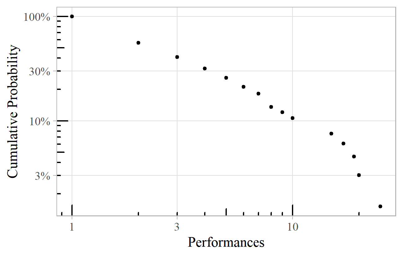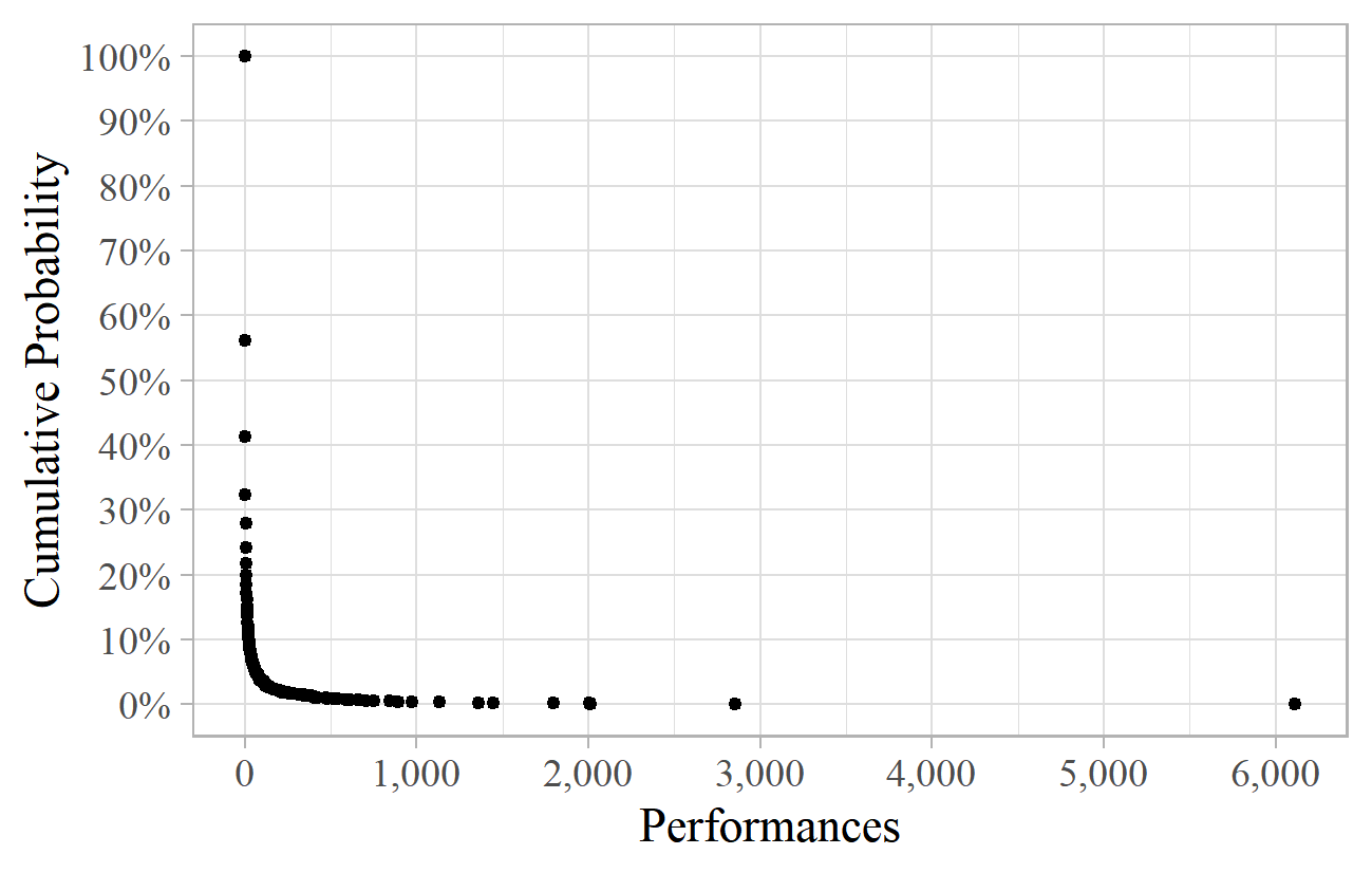 Figure 1 illustrates this data graphically. It shows the proportion of composers (on the vertical axis) with at least the number of performances shown on the horizontal axis. Thus, top left, 100% of composers had at least one performance, and 56% had at least two (i.e., 100% minus the 44% with exactly one). Wagner, with 6,100 performances, is represented by the dot on the far right. The proportion of composers falls off very rapidly as the number of performances increases, and the fortunes of the big-name composers are extreme compared to the majority. The average number of performances is about 23 (i.e., 58,000 performances divided by 2,500 composers), although this does not represent a typical composer: 90% of composers had fewer appearances than this.