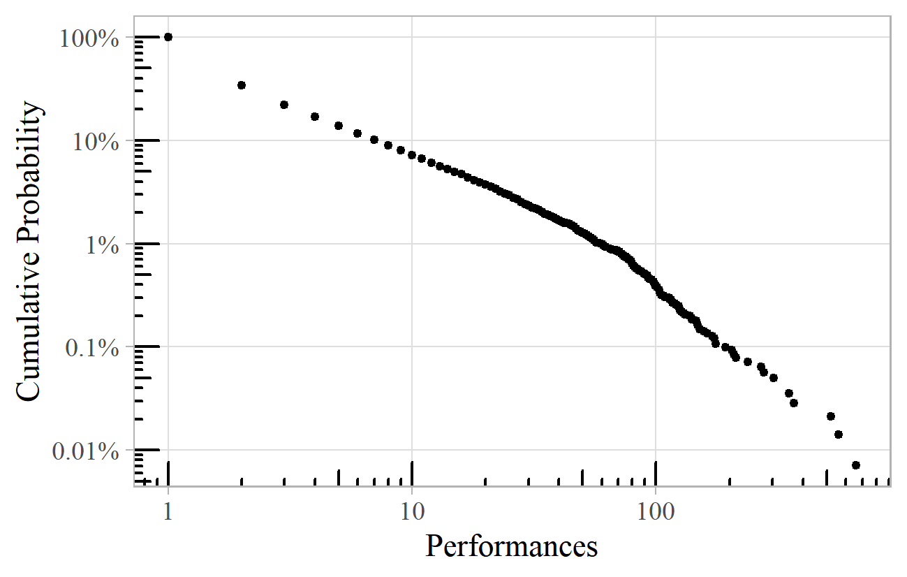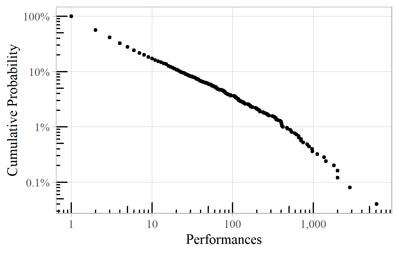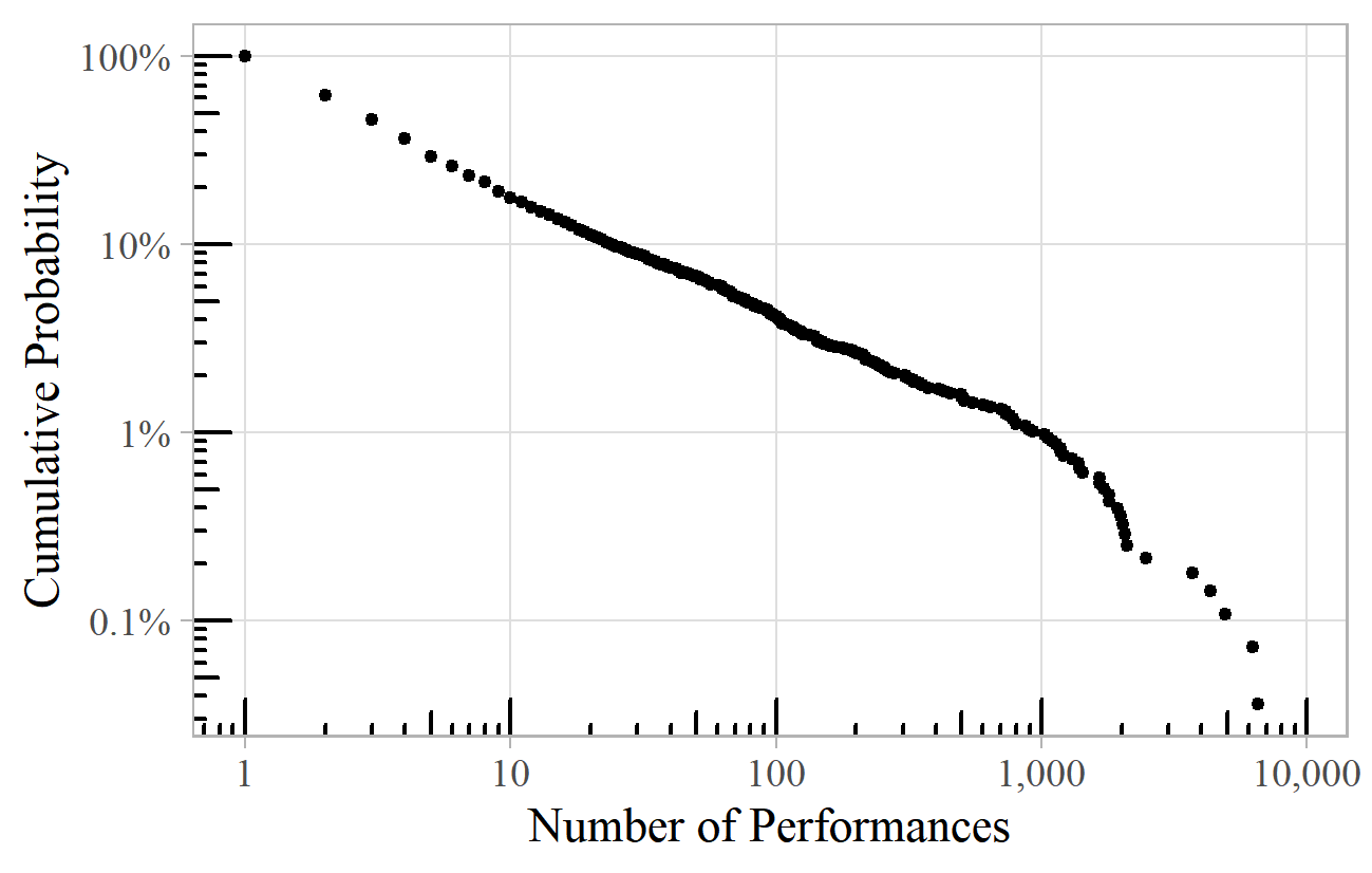 - After 10+ years, the total number of times each work has been performed approximately follows a power law with exponent 2.0.