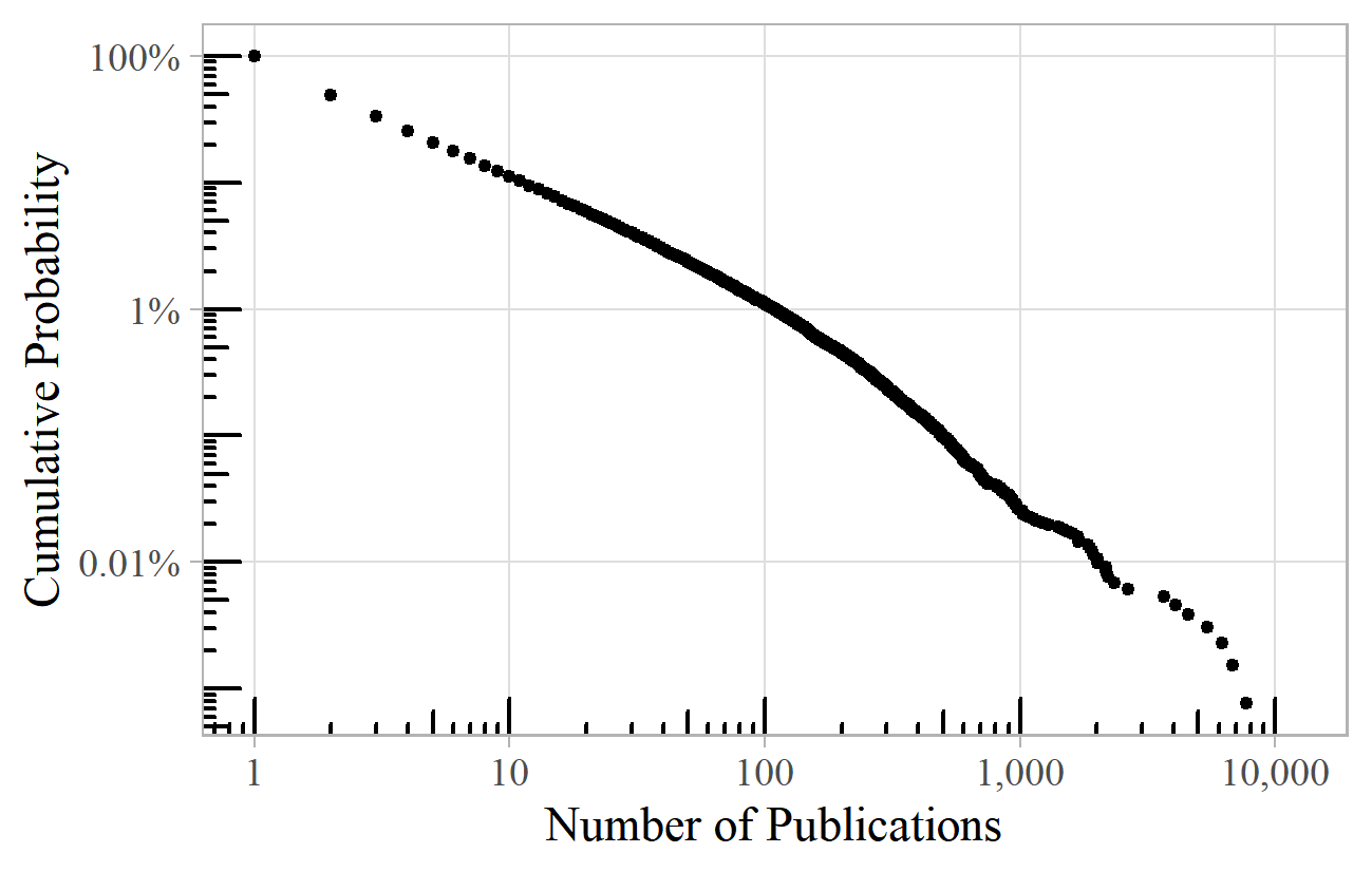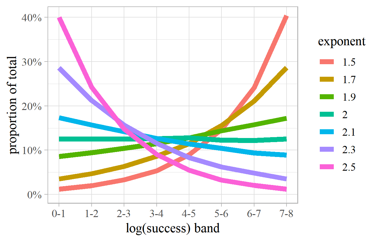 Several of these examples show a slight downward curvature on a log-log plot, rather than the perfect straight line of an exact power law. This will, other things being equal, tend to give slightly greater weight to the activity of the higher log-success bands. In these cases, an estimated exponent a little higher than two will offset this curvature to produce a more even distribution across the bands.