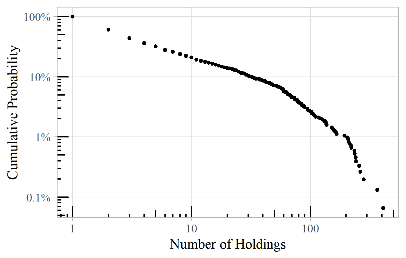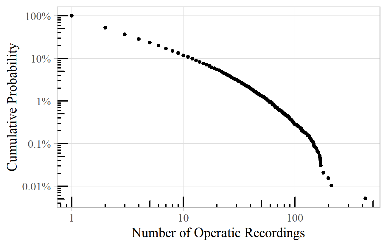 Power laws appear in the relationship between recordings and performers. Figure 15 shows the number of opera recordings in which individual singers have been credited. 19 The exponent here is about 2.2. This power law breaks down on the right. It is not uncommon for power laws to deviate from a straight line at the ends of the range. At the bottom, data might be censored if obscure works are unknown or omitted through a lack of space or interest. At the top end, there are often practical limits, such as how many recordings one singer can realistically undertake in a lifetime. The individual who breaks this barrier on the far right of Figure 15 is Placido Domingo, with more than twice as many recordings (426) as his nearest rival Montserrat Caballé.