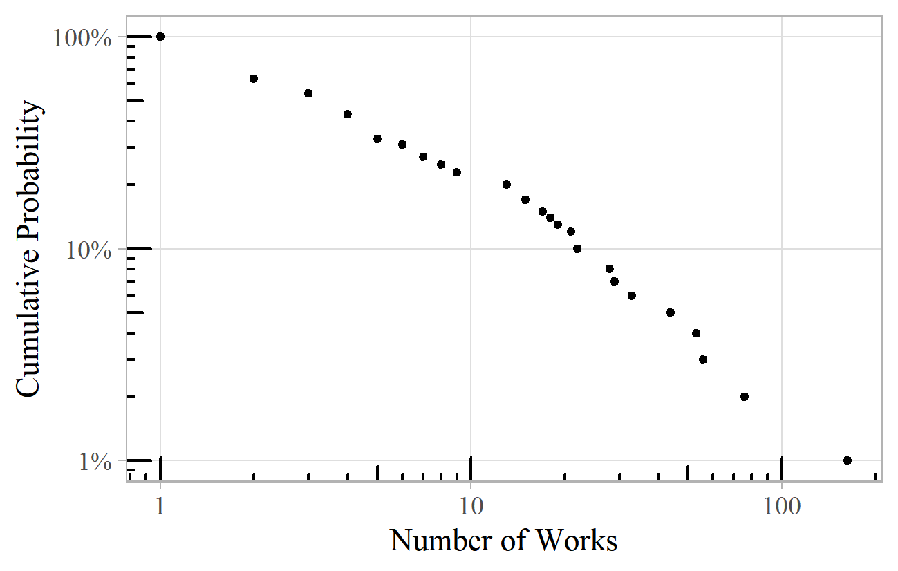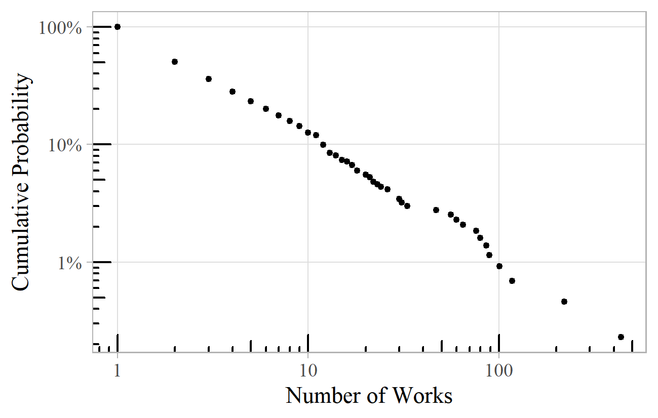 Figure 8 shows the number of works per composer from a sample from Franz Pazdírek's (1904-1910) Handbook of Musical Literature cataloguing all printed music available, worldwide, in the early years of the twentieth century. The exponent is 1.8.