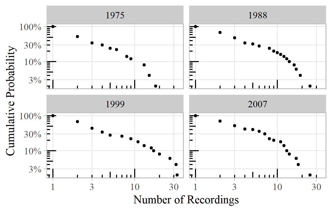 Moving on to recorded music, the distribution of the number of recordings per work based on samples from several editions of the Penguin Record Guide (Greenfield, Layton, & March, 1975, 1988, 1999, March, Greenfield, Layton, & Czajkowski, 2007) is shown in Figure 10. 13 The exponents range from 1.9 to 2.3.