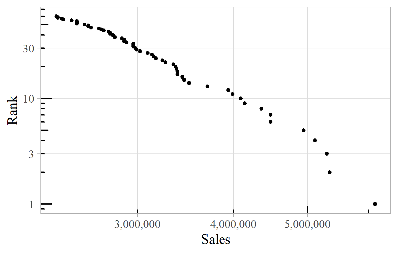 In popular music, power laws have been found in the number of gold records per artist (Cox Felton, & Chung, 1995), market shares of "Billboard Hot 100" singles (Haampland, 2017), the evolution of tracks in emerging genres (Keuchenius, 2015), the popularity of streamed songs (Krueger, 2019, pp. 86-91), and the listening habits of users of last.fm (Koch & Soto, 2016). Figure 11 shows a chart of UK all-time top 60 album sales. 14 This has a rather larger exponent than we have seen so far, 4.8, although this estimate is based only on the extreme end of a much larger distribution of all album sales, the data for which is not readily available. A similar high exponent is found for the chart of million-selling UK singles. 15