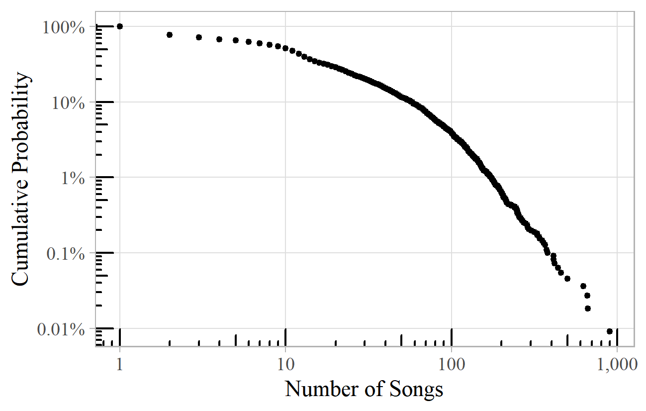 - After 20+ weeks, the weekly number of listeners per song is distributed roughly as a power law with exponent of about 2.0.