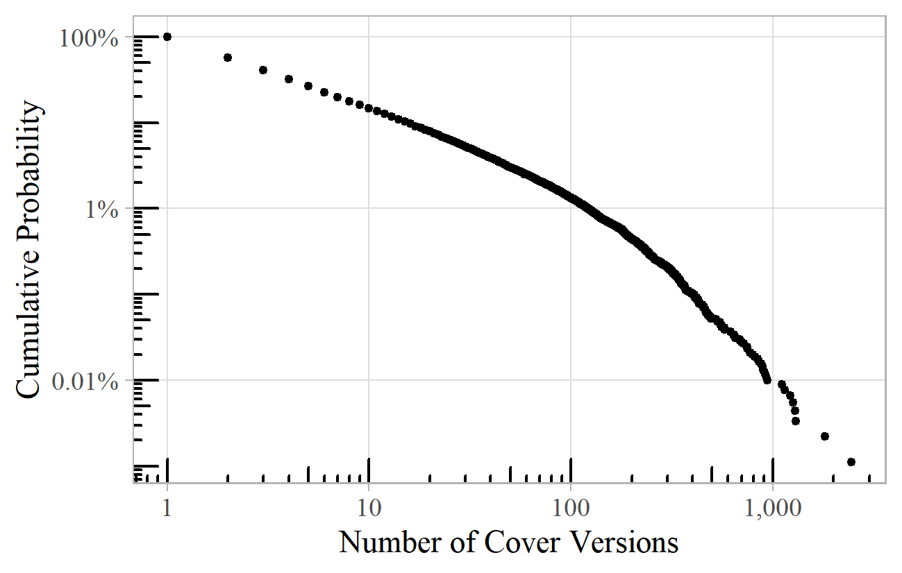 Figure 13 shows the power law distribution of the number of cover versions of popular songs, as listed on the "Second Hand Songs" website, with "Silent Night" on top with over 2,000 covers, and Gershwin's "Summertime" in second place. 17 The exponent here is about 2.0.