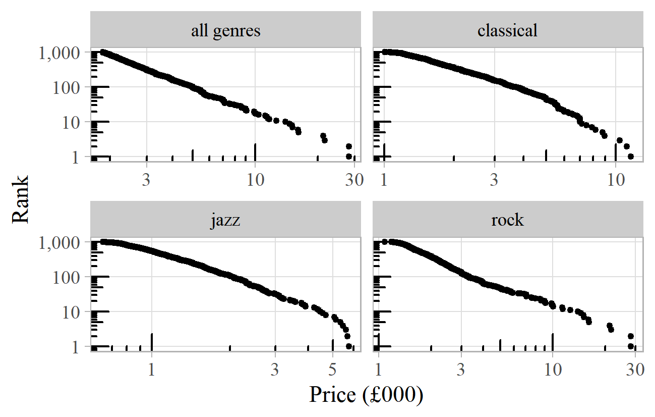 Power laws also describe auction prices paid for rare records. The website "Value Your Music" collects data for several formats and genres, and the distribution of the top 1,000 prices is shown in Figure 14 for vinyl records in total (top left) and the separate categories of classical, jazz and rock. 18 These have exponents between 3.3 and 4.2. As with the Haydn symphonies, the subsets of individual genres follow power laws within a similar distribution for the population as a whole.