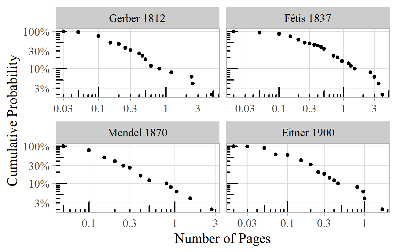 Even writing about music has power law characteristics. Biographical dictionaries have article lengths that follow this pattern. Figure 16 shows the article lengths for samples from four major European nineteenth-century biographical dictionaries. 20 The exponents range from 1.8 (Fétis) to 2.3 (Mendel). Whilst Mendel (bottom left) has a good straight line throughout, very short articles are underrepresented in the other sources, which might be better described by a lognormal distribution. This could be due to censoring of unknown or obscure names as discussed above.
