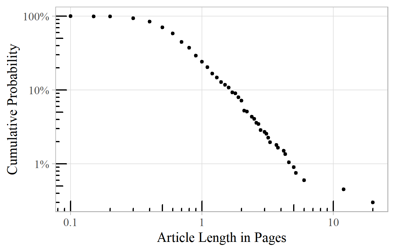 Oxford Music Online shows a lognormal-like distribution of article lengths (Figure 17). 21 Between half a page and six pages there is a nice straight line (with exponent of about 2.5), but shorter and longer articles do not fit the pattern. There is perhaps little point in very short articles, so the distribution is censored at this end. For long articles, there may be distortion due to the sampling method. Plotting this data as a histogram, with bands of log(article length) on the x-axis, and bar heights equal to the number of articles in each band, we do indeed see the familiar bell-shaped normal curve – indicating a lognormal distribution.