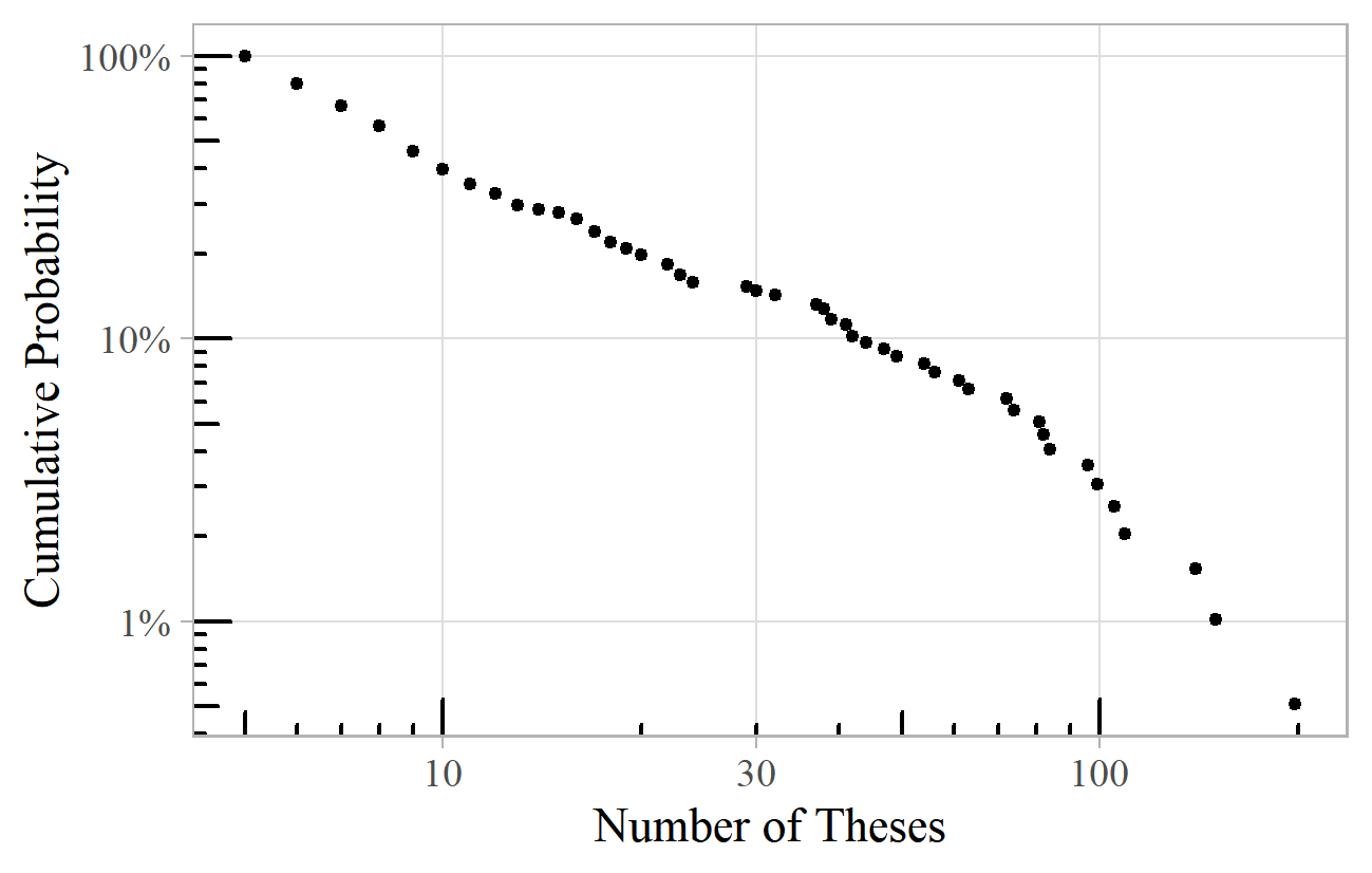 Finally, in this short survey of power laws in music history, we find them occurring in academic writing. Figure 18 shows the distribution of composers mentioned at least five times in the titles of PhD theses. 22 Composers mentioned in the titles of articles published in the Journal of the Royal Musical Association (JRMA) also follow a power law. 23 The PhD theses power law has an exponent of about 2.3, and the JRMA articles an exponent of 2.8. J. S. Bach is the top composer for PhD theses, followed by Mozart and Beethoven. Mozart is top among JRMA articles, followed by J. S. Bach and Beethoven.