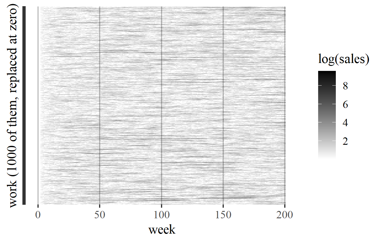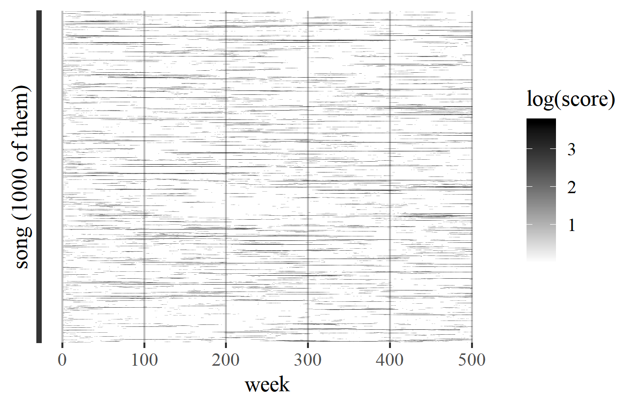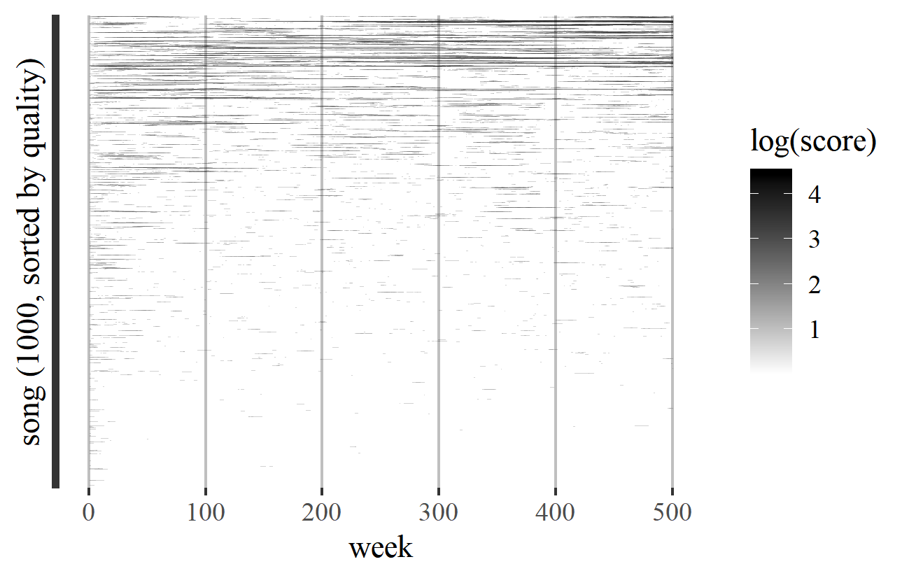 In Model D, in contrast, success is transient: works remain successful only for as long as they enjoy a run of positive or zero growth. This is like getting a run of heads in successive tosses of a coin: such runs do happen, but they rarely last long. A successful work's luck will soon run out, and another will replace it at the top of the chart. This is illustrated in Figure 19, which shows a simulation of Model D. The works (or their replacements if they fall to zero) are shown as horizontal lines, with time running from left to right. The darkness of the lines is proportional to the logarithm of the works' sales. In fact, every work (or its replacement) in Model D is destined to be the top-selling work at some point.