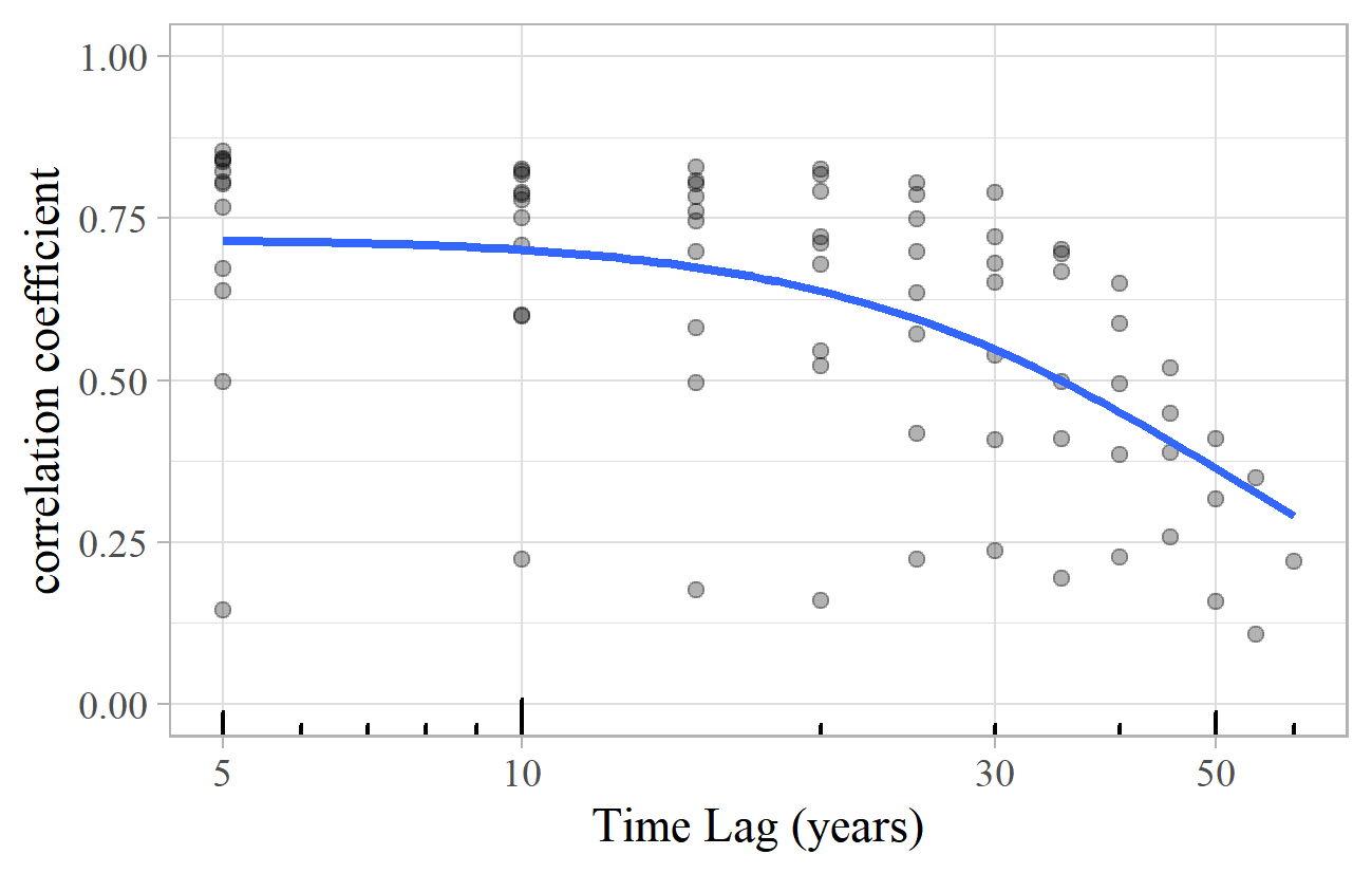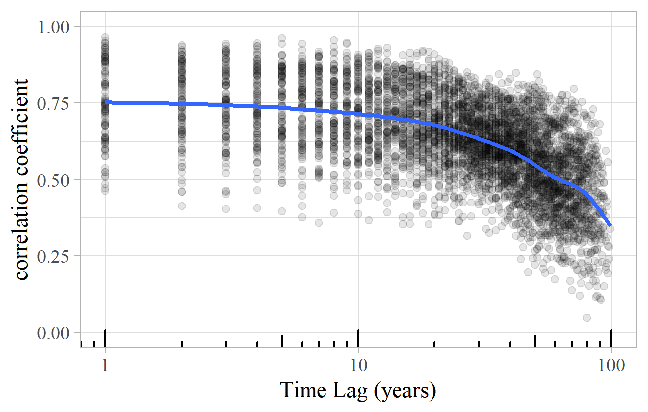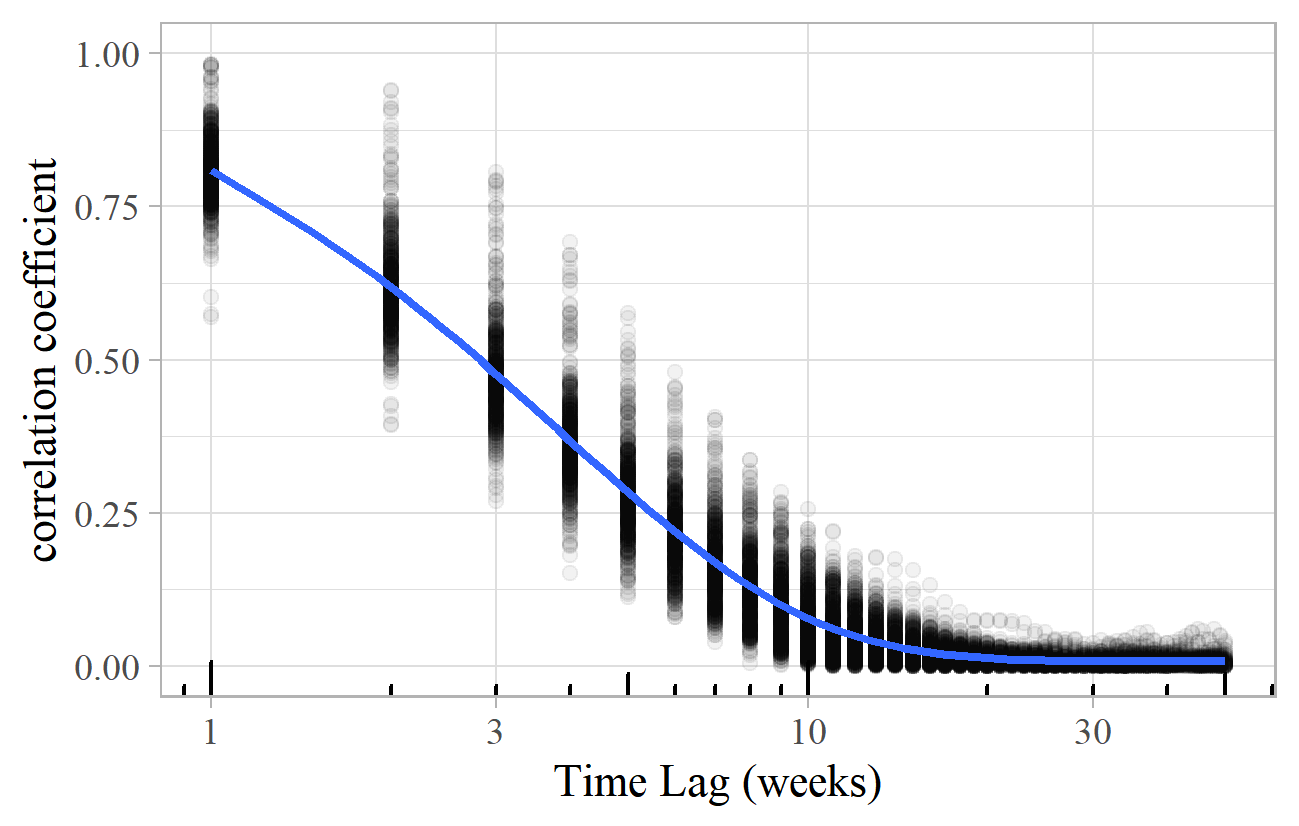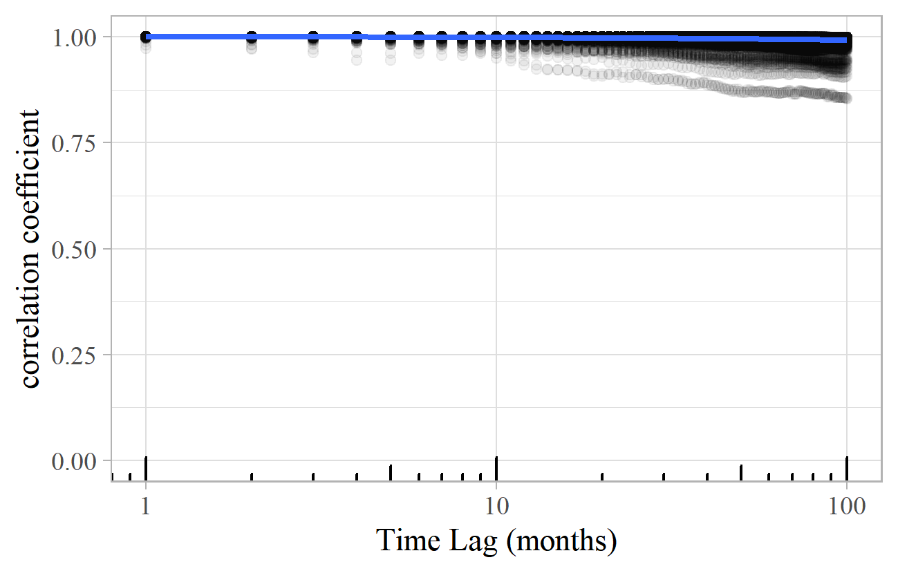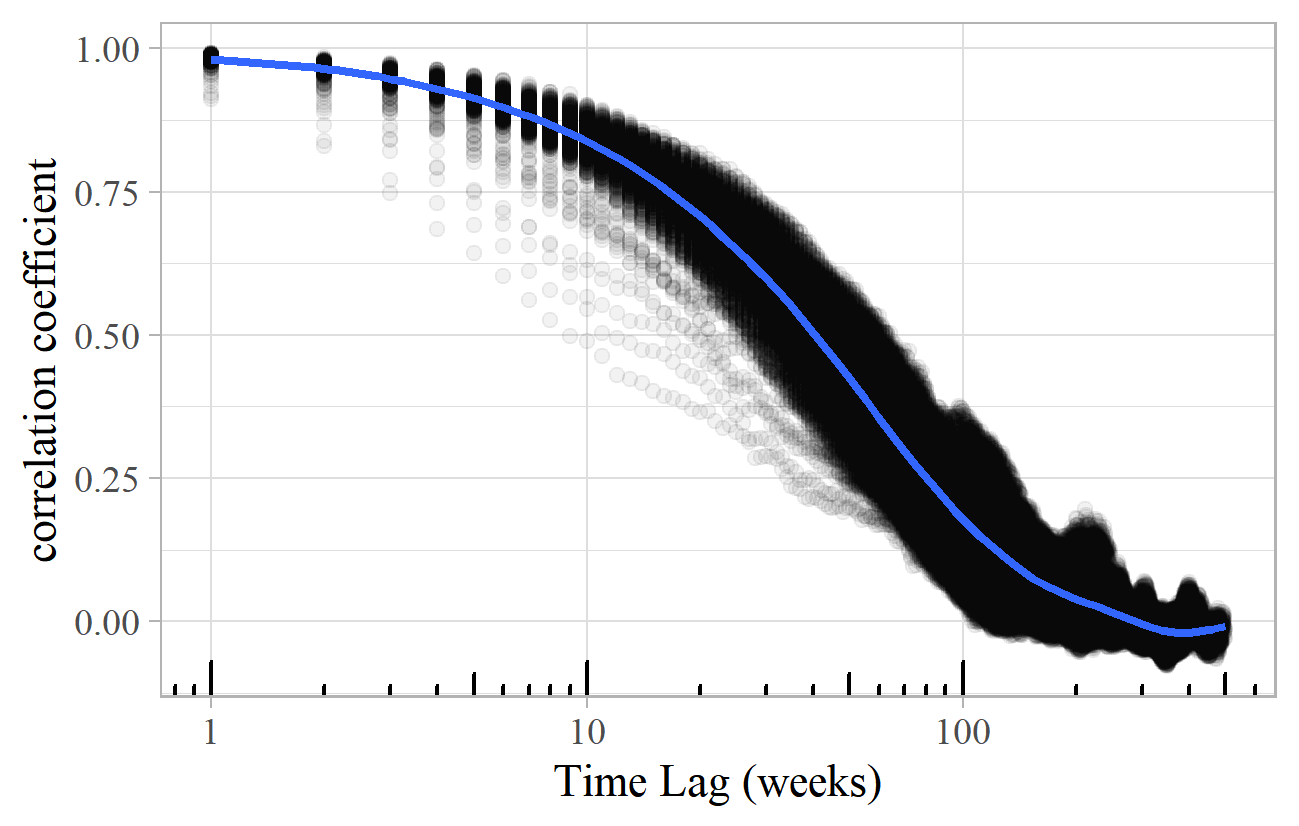 For Model D, the lagged correlation chart is shown in Figure 22. The one-week correlation is again close to 100%, and the average falls to 50% after about 12 weeks, and to zero after around 50. The most noticeable difference compared to Model F is the wide range of correlation for each value of the time lag – the period between 10 and 30 weeks includes correlations covering almost the full range from zero to one, whereas in Model F they are closely clustered around the trend line.