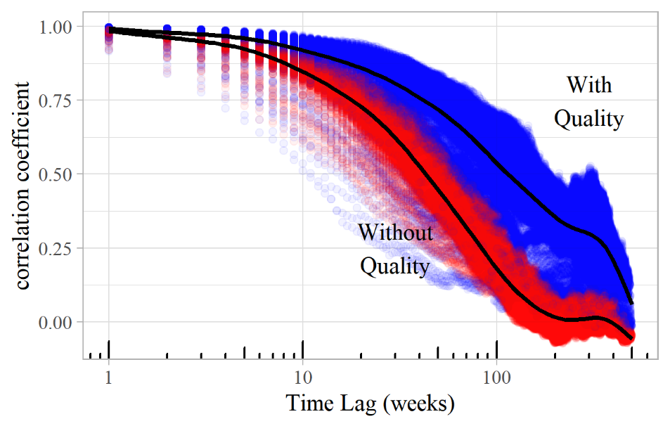 Whilst there is clearly a qualitative difference between these transience plots, they are hard to interpret and compare. A more objective way of quantifying these transience patterns is to calculate the correlation between the success scores at different times. This involves taking two points in time, and calculating the correlation coefficient between the success scores of all songs at those times. 28 These values, for all combinations of times, can be plotted on a chart such as Figure 21, which shows the lagged correlation coefficients for a typical simulation of Model F. Each point on the chart shows a pair of weeks, according to the difference between them (on the horizontal axis – note the logarithmic scale), with the correlation between the popularity of the songs at those two points indicated on the vertical axis. There is high correlation (almost 100%) between the popularity in successive weeks (i.e., lag 1) on the left of the chart, and it takes about 40 weeks for the correlation to fall to 50%. There is practically no correlation between the levels of popularity at times separated by 200 weeks or more.