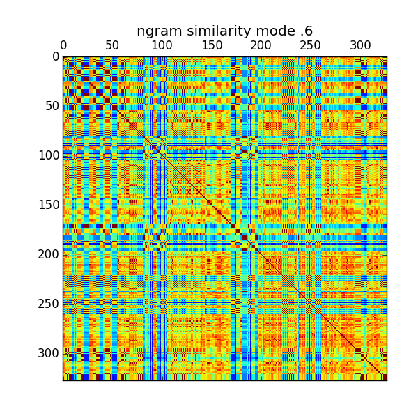 We applied precisely this approach to the analysis of the chant corpus. Each chant was converted to a vector by counting the number of occurrences of each 1-gram, 2-gram, 3-gram and 4-gram – viz., we recorded the number of times each short melodic sequence occurred in the chant. We then computed the 'distance' between any two chants as the cosine similarity between their associated vectors. The result of these comparisons can be seen in Figure 1 in which the 780 mode 6 melodies were compared to each other for structural similarities. Each row, and the corresponding column, represent one chant. The color of the matrix entries describes the distance between every pair of chants. Even a cursory glance at this matrix, with no further analysis, shows manifest evidence of structure and varying degrees of relatedness between chants.