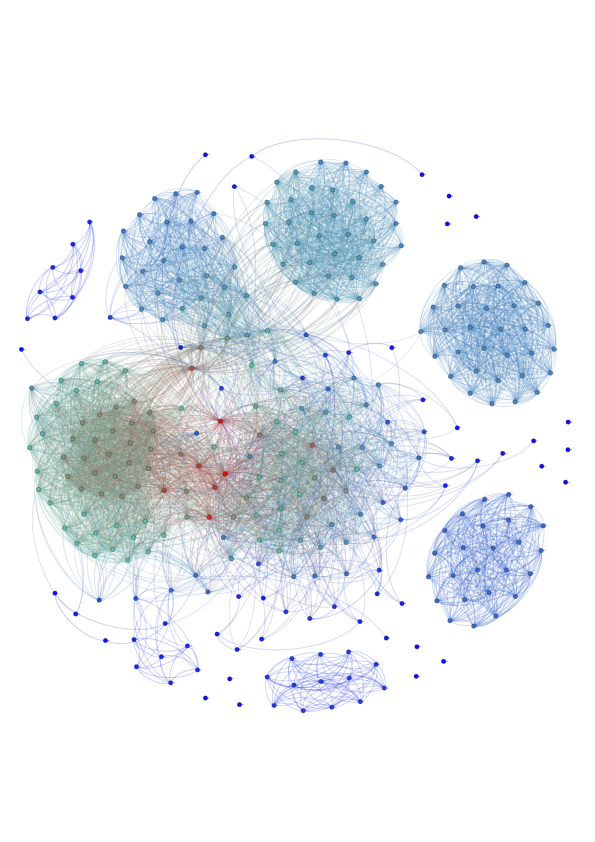To investigate this structure further, we turned to network theory. A network is composed of nodes – drawn as dots and representing objects – and edges which connect nodes that are related; in our work, each node represents a chant. If two chants are 'close enough' 2 to each other, we connect them via an edge. The network theory literature provides us with a host of algorithms for community (or module) finding in these graphs. We employed here a simple Louvain module-finding algorithm and visualize the results in Figure 2.