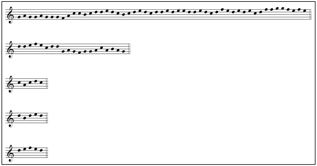 We trained an RNN on the chant corpus and then prompted the RNN to generate new sequences, which displayed many of the hallmarks of a typical late medieval chant. Most arresting was the RNN's inclusion of short melodic gestures that were very similar to differentiae, which are short (usually 5 or 6 pitches) 'riffs' given at the end of an antiphon to indicate which tone should be used for the singing of its psalm pair. This was particularly unexpected because differentiae are not included in the dataset that the RNN learned from. While this production of 'robot chant' might seem little more than a party trick, it is meaningful. Indeed, the generated sequences are a window into the statistical patterns learned from the training corpus. The RNN has no knowledge of the rules of chant, no formalized encoding of the syntax, and no means to comprehend the semantics; it is a purely statistical artifact. It is, nevertheless, able to recreate apparently authentic sequences which any medieval monk or modern scholar would recognize as a psalm tone cadential formula. This means that these 'riffs' must be embedded in the melodies of the antiphons and responsories sung in the same contexts as the psalms, for them to be 'learned' by the RNN. For example, in Figure 3 the last three, short 'riffs' in mode 7, generated by the RNN, would remind anyone at all familiar with the tradition of psalm tone Differentiae. The longer melodies, shown above the three short ones in Figure 3, also bear a startling resemblance to a real mode 7 melody in terms of where the intervallic leaps fall, how cadences are approached, and the number of repeated pitches allowed before motion up or down is required. (See Figure 4.)