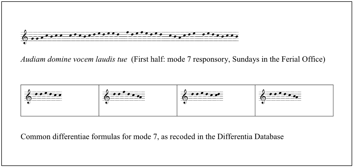 It may seem strange to take a strictly empirical approach to something as nebulous as musical intuition about modes, especially the kind of centuries-old musical intuition that comes to us through extant sources. The variance between manuscript readings, the uncertainty about performance conventions, and even the likelihood of mistakes or omissions in the data itself, all warn against making too many assumptions. However, the scale of our corpus ensures that the presence of occasional individual errors contributes only a small amount of 'noise' to an overwhelmingly strong statistical signal. Only a decade ago it was rare to find genre studies or comparative analysis that included more than several hundred melodies. The present study looks at 5,906 chants across all the genres sung for the Office, found across Europe, spanning several centuries, at a level of detail that was impossible in Hughes' time, although obviously not inconceivable. Hughes collected and curated this data for just such a purpose. By isolating particular 'riffs' that characterize modal idioms and tracing their appearance through a large dataset, we begin to be able to 'zoom out' far enough to make the kinds of observations about medieval musical tendencies, assumptions, and preferences that Hughes, and other scholars of his generation, had hoped would be possible, based on their work. At the base of a chant scholar's work is an ever-present doubt about how much we can trust our own musical impulses and assumptions to be like those of medieval singers. The more we can replace our own conjecture with hard evidence about their musical world, and the more robust and expansive that evidence becomes, the greater our ability, as scholars, to stay true to the world we wish to explore. The idea of musical modes originated as sets of recognizable turns of phrase that were distinctive from each other in pitch order and relationship has been suggested in various ways over decades, but now our initial findings support this idea with empirical data. Given that most of the melodies considered in this dataset come from the late medieval, musically literate time period in which modes were fixed and well understood theoretically, it is evident that these (originally unwritten) musical gestures are still present at a structural level and revealed when considered and compared in their thousands. These 'sticky riffs' are usefully understood as core components of a singer's idea of a modal system of chant and the melodies afforded by it.