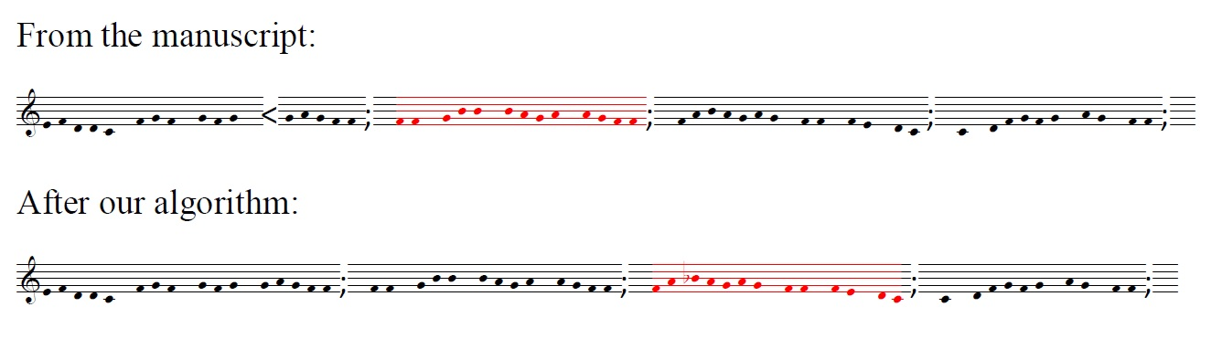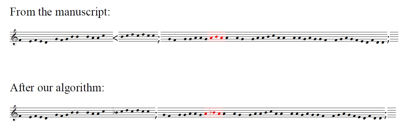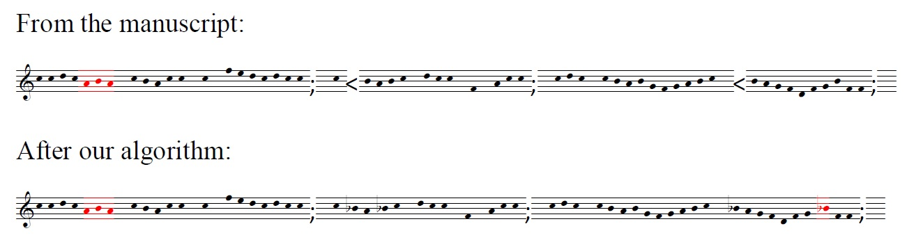After much experimentation, we have arrived at the following heuristic for determining b-flats as they may or may not be written in the manuscript source. They are given in the End Notes. 3 These classifications of flats—Real, Implied, and Associated—are a way of attempting to capture the process a singer familiar with the conventions of their time goes through to determine whether to sing what they see on the page, or to 'correct' it to be what they know should be sung. The haphazard placement of flats and lack of formal notation rules in the source manuscripts introduce a significant challenge with a large dataset. It is insufficient to rely only on the 'Real' flats because the author's intent is not always clear when a flat is notated, and so new heuristics must be developed, as shown above. What follows are some examples of the process of creating and testing our algorithm. In the following examples, '<' represents a flat sign found in written in the manuscript and ';' represents the end of a phrase notated with a rhyming word in the manuscript.