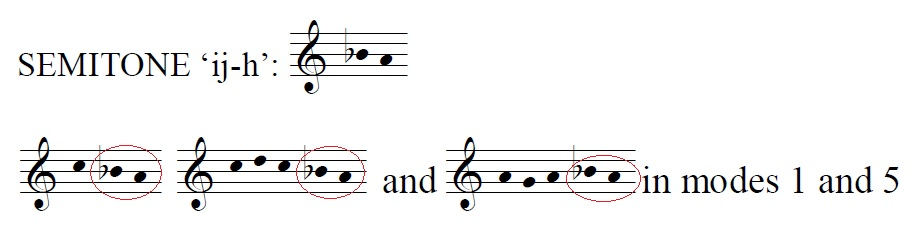 Approaching the semitone with 1-h-g-h-ij-h is seen in mode 1 chants 41.9% of the time (and 21.8% of the time in mode 5). However, approaching the semitone with 1-k-ij-h- or 1-k-l-k-ij-h- is seen 53.6% and 50.8% of the time respectively in mode 5. Here again, the direction from which the semitone is approached can be understood to 'signal' where the singer is relative to the Final of the mode in question.