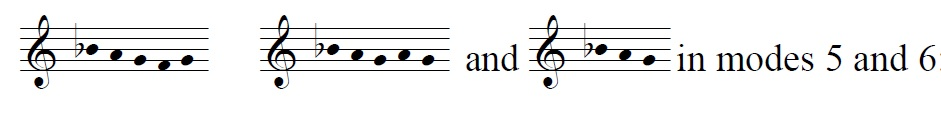 Whereas in mode 1 melodies treat this semitone as a signal that a word is ended, in modes 5 and 6 it is often followed by a 'g' and used as a signal to continue across the word or phrase where it is found. The riffs shown directly above are found mainly in modes 5 / 6 for these purposes. In mode 5, one of these three riffs follow the
