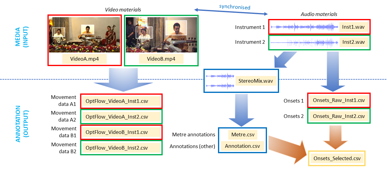 The research questions, which included the variability of synchronization accuracy and precision and the role of body movement in ensemble coordination between diverse musical genres, required corpora including multitrack audio recordings (to facilitate event onset extraction for synchronization analysis) as well as video footage shot with static cameras (to facilitate the use of existing movement tracking algorithms for movement coordination analysis). No shared corpora meeting these criteria were available. This is a well-known problem for cross-cultural computational musicological analysis. Numerous other sources of audio and video recordings of diverse musical traditions exist, of course, from commercial recordings to curated audiovisual archives and items uploaded to web services. Most sources, however, lack reliable metadata and expert annotation; very little multitrack audio is freely shared, and high-quality video material using fixed cameras is also rare. Research collections are often retained by the researchers who recorded them and not shared with the wider community – sometimes for good reasons such as commercial or ritual sensitivities. The CompMusic project led by Xavier Serra addressed some of these issues in studying five diverse musical traditions (Serra, 2014). Corpora gathered for this project were compiled from existing recordings and are either freely shared or available to registered researchers and include extensive metadata: recordings are not multitrack however, and the collections do not include video.