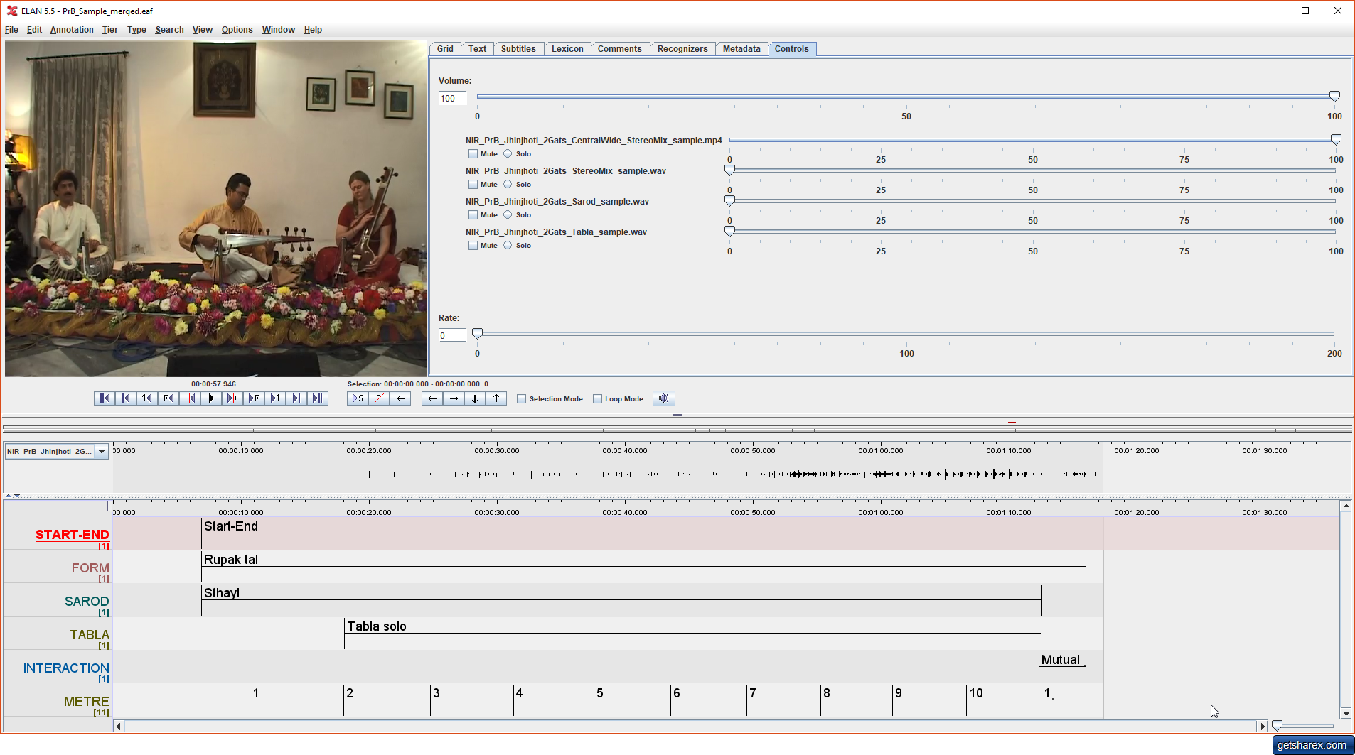 - Use Edit/Linked Files to Add all of the files in the Sample/Media folder; NIR_PrB_Jhinjhoti_2Gats_Tabla_sample.wav is selected here in the dropdown box to the left of the audio waveform window. The Control window (shown top right) can be used to select which audio track(s) play back.