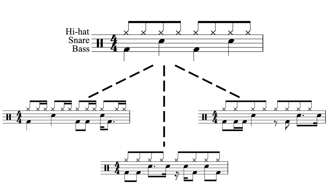 The archetypical rock beat is strongly articulated in all three datasets: the bass drum strokes on beats one and three, the snare drum hits on the backbeats (two and four), and the regular eighth-note pulse of the hi-hat show a robust presence throughout all three Drum Groove Corpora (Figure 4). It can be seen, however, that the Magenta snare drum pattern is quite versatile, whereas, in the Loop and Lucerne corpora, the main role of the snare drum is to articulate the backbeats.
