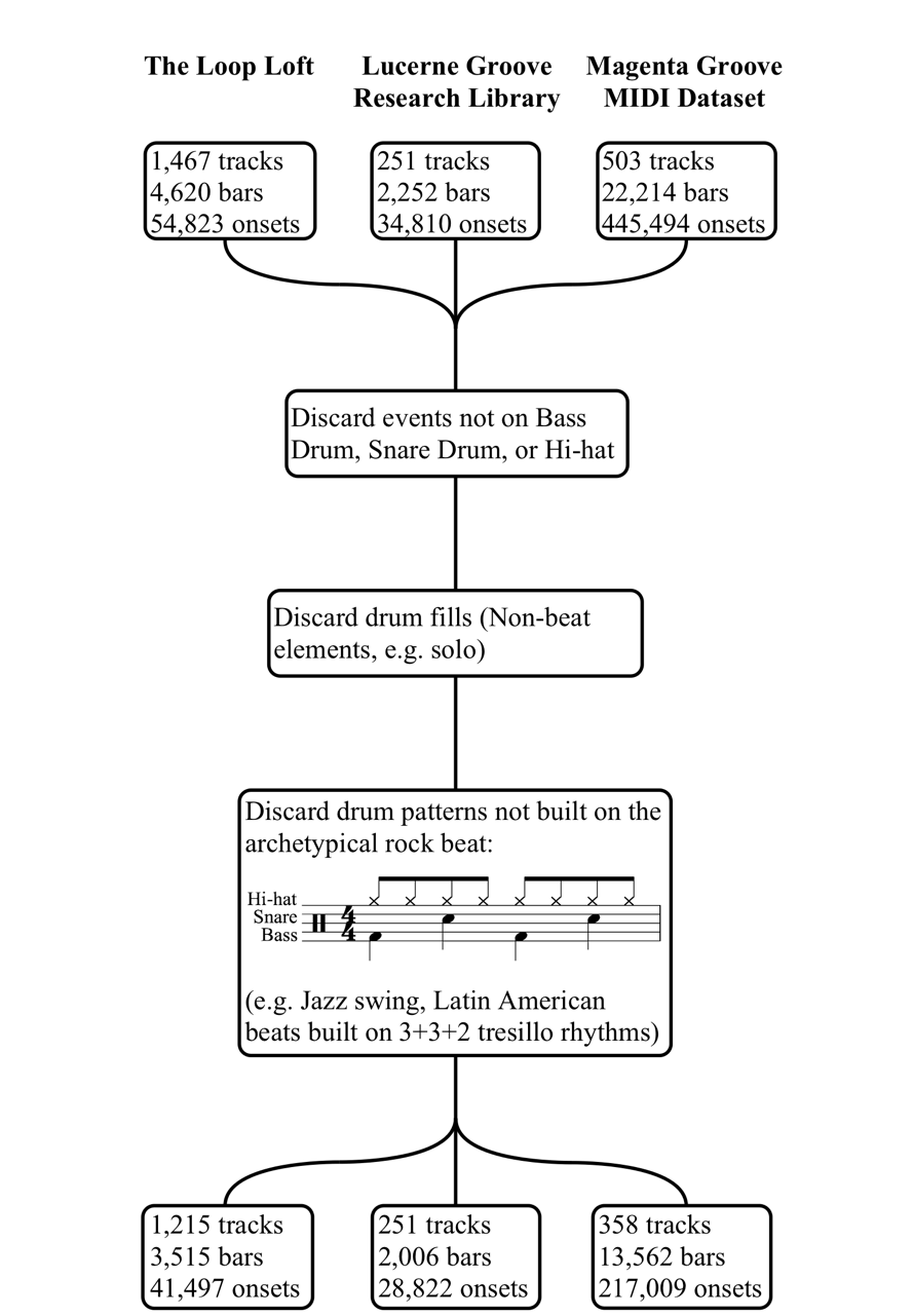 The differences in how the filtering process affected different corpora may be attributed to the unique nature of the performances captured by each set. For example, the Lucerne corpus is comprised entirely of the "core grooves" of famous songs in typical rock/pop styles and so no complete tracks were excluded from the set. The Loop Loft corpus, however, features numerous tracks explicitly labelled "Fill" and numerous tracks in Latin American styles, so several complete tracks were excluded. Likewise, the Magenta performances are in a range of styles, and often feature extended drum solos and groove patterns that are based around the tom-toms (these bars are filtered out). Unfiltered data sets are available upon request.