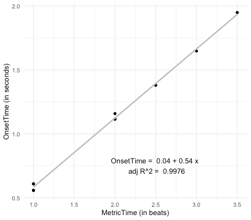 Fig. 3. Example of the linear regression used to model the MetronomicOnsetTime. Points represent individual drum onsets, and the grey line is the fitted regression line.
