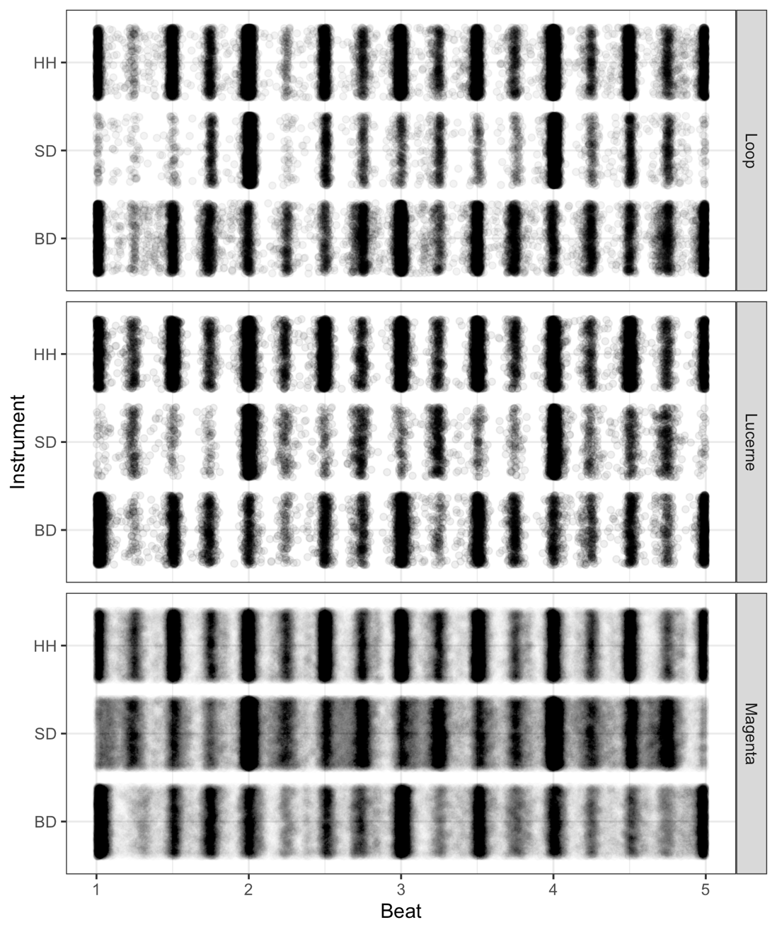 The mean microtiming deviations are zero for all three corpora (Table 1). This is a direct consequence of the regression approach taken to fit the MetronomicOnsetTime to each track. But the standard deviation of the microtiming deviations (MicrotimingBeats) in the Magenta corpus (0.0509 beats) is substantially greater than the standard deviations in the Loop (0.0277 beats) and Lucerne corpora (0.0283 beats). These differences in "tightness" are visible in Figure 4: the markings on each metric position are temporally (i.e., horizontally) more spread out in the Magenta corpus compared to the other two corpora.