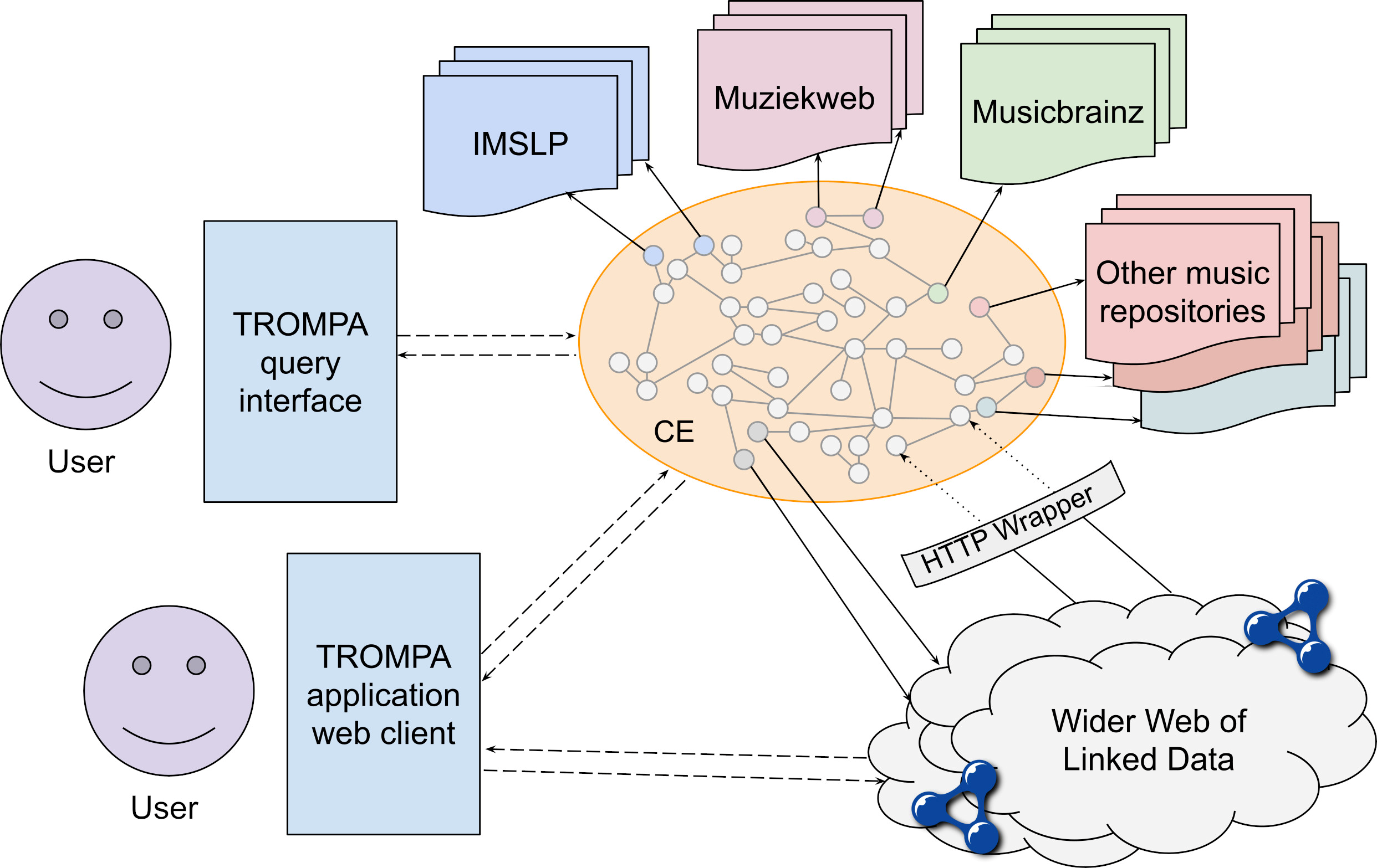 TROMPA's motivation lies in the interconnection rather than the integration and ingestion of information in public-domain music repositories. It would be costly and counterproductive to attempt to supplant established repositories by copying entity descriptions and media representations into a centralized database under a unified data schema. Rather, we describe the contents of such repositories by reference, using URIs to address, interlink, and contribute layers of enriched descriptors and content to resources hosted in situ at their native (TROMPA-external) Web locations (F1, A1, A2, I3).
