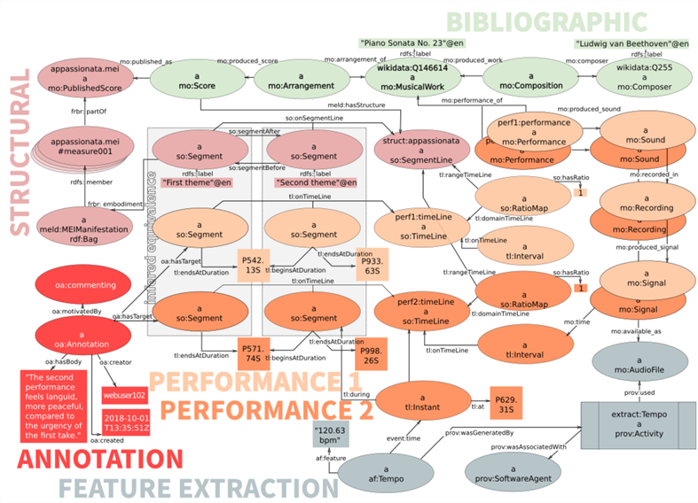 To accommodate the interconnection of multimodal music information resources by reference to score encodings (I3), TROMPA applies a specialized alignment data model implementing the Music Encoding and Linked Data framework (MELD) (Weigl & Page, 2017), combining several standardized, FAIR-compliant vocabularies (I2, R1.3) to express alignments between performance recordings (Timeline and Event Ontologies; Raimond, Abdallah, Sandler, & Giasson, 2007) and musical score (Segment Ontology; Fields, Page, De Roure, & Crawford, 2011; with anchors in MEI), while interlinking with bibliographic information (Music Ontology; Raimond et al., 2007) and performance feature data (Audio Feature Ontology; Allik, Fazekas, & Sandler, 2016) (see Figure 2).