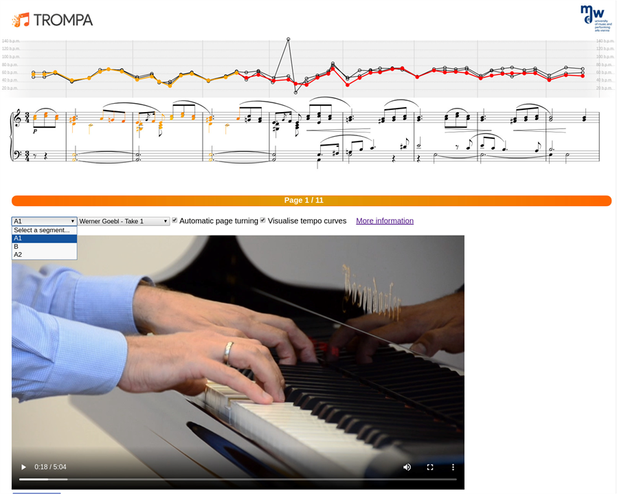 Fig. 3. The Companion for Long-term Analyses of Rehearsal Attempts (CLARA 20; Weigl & Goebl, 2020), one of several specialized TROMPA web applications (available online at https://trompa.mdw.ac.at), demonstrates alignment between rendered MEI score encodings, multiple performance timelines, and audiovisual recordings on two levels of granularity: note-level (to generate tempo curves of different performances) and section-level (to generate a navigation drop-down menu allowing users to jump score page and audiovisual playback, here to section A1, B, or A2 of the piece).