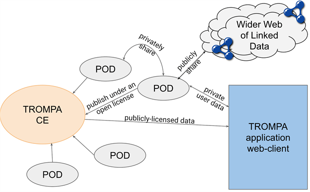 While such open publication 'by fiat' (or rather, by the will of the TROMPA consortium) is not particularly problematic where data is generated by automated processing of public-domain information, the situation is complicated considerably in the case of user contributions. Humans reporting on their subjective experiences or providing expert insights or artistic contributions may be understandably concerned about safeguarding their data, and indeed their rights to such safeguards are guaranteed by the EU GDPR and similar legislation. To accommodate these rights, TROMPA's data infrastructure employs a secondary, decentralized layer of so-called personal online datastores (Solid 23 PODs; Figure 4).