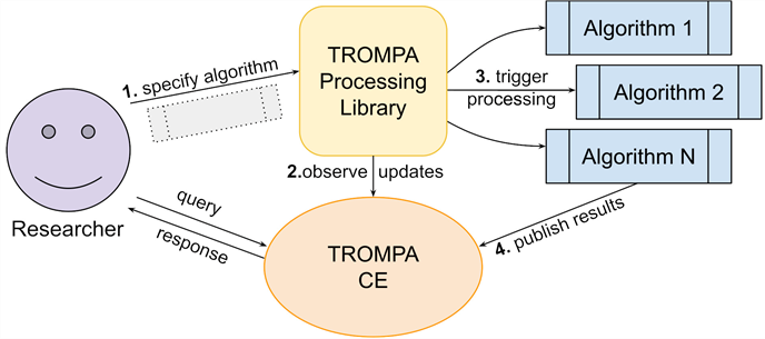 Fig. 5. TROMPA Processing Library (TPL) workflow. (1.) The researcher specifies their algorithm for use with the TPL. (2.) The TPL continuously monitors the CE's graph. When a new node is ingested with a type matching a TPL algorithm's specification, the algorithm is triggered on the newly entered data (3.), before publishing the results to the CE (4.), where they become available for query and may potentially trigger further processing orchestrated by the TPL.