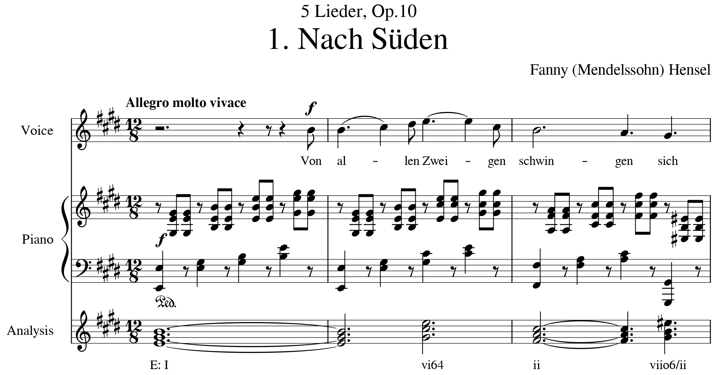 Fig. 1. Fanny Hensel (née Mendelssohn)'s 5 Lieder, Op.10 No.1: 'Nach Süden' as an example of an OpenScore Lieder Corpus score with aligned harmonic analysis part added.
