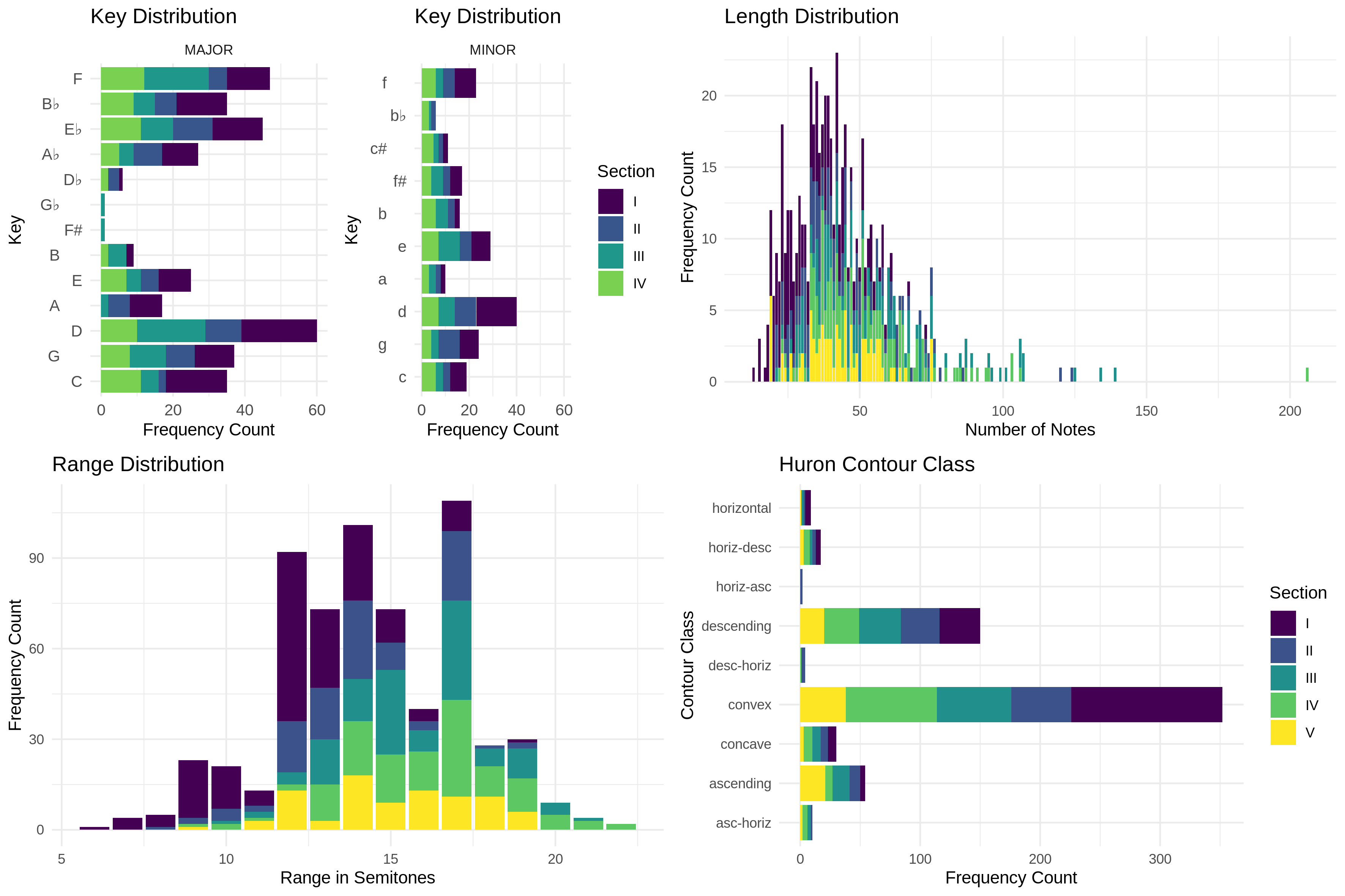 The figures presented in this data report describe the MeloSol corpus from a macro perspective. I note that Section V was removed from the top left portion of Figure 1 as the majority of melodies in the atonal section of the corpus are encoded with a zero flat, zero sharp key signature and including those in the figure would skew C major and A minor's representation. The bottom right panel describing the Huron Contour Class is computed using the FANTASTIC toolbox (Müllensiefen, 2009) described below and was first presented by Huron (1996).