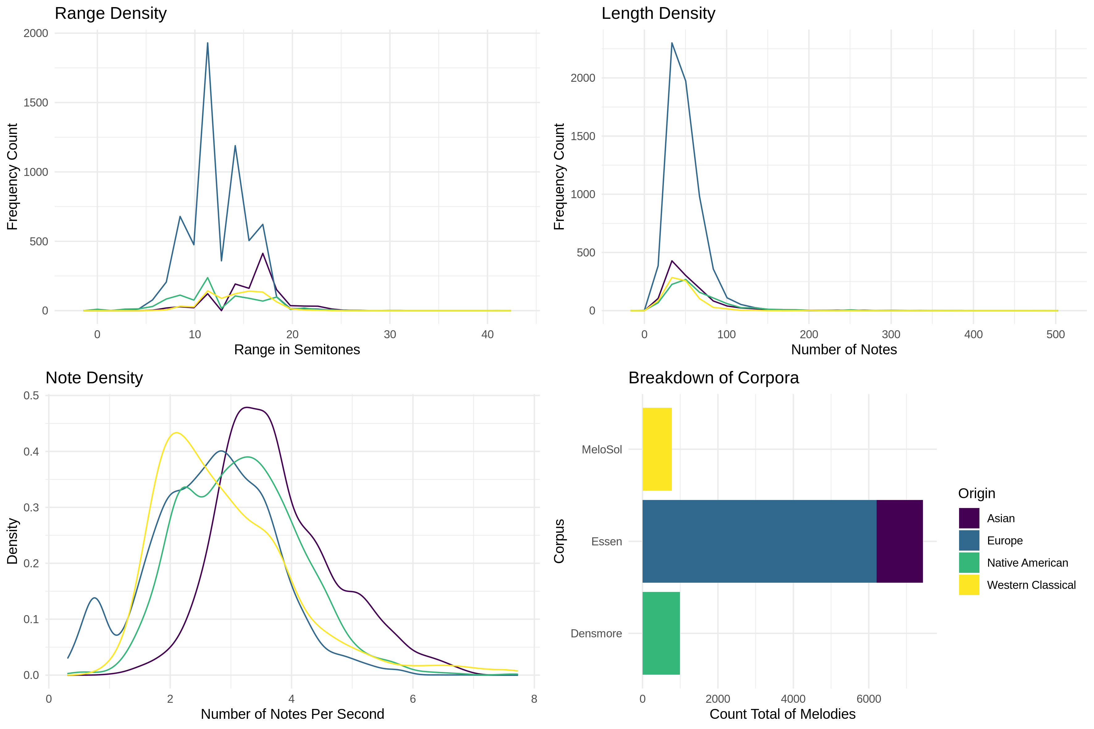As evident in Figure 2, the MeloSol corpus— shown in yellow on all plots— is relatively smaller than the Essen (blue and purple) and the Densmore (green) by a factor of 9.5 and 1.3 respectively. Though given this large difference in total size, the distributions of some summary features exhibit similar properties. For example, as evident in the top row of Figure 2, all corpora tend to fall within the same bounds of both the range and length metrics but exhibit different patterns within those bounds. The range density of the Asian and European subsets of the Essen corpus have median pitch ranges of 17 and 12 semitones respectively. The Densmore appears to have a distinct peak at 11 semitones, contrasted with no clear peaks emerging from the MeloSol. This pattern could possibly reflect the compositional and didactic constraints of the MeloSol melodies compared with melodies that do not generate from such a constrained system. While some melodies in all corpora extend far beyond 100 notes, this might actually reflect the explicit repetition of musical material instead of the use of a repeat or da capo. Future users of this corpus may be interested in performing their own exploratory data analysis with the extreme outliers excluded, as more granular patterns are visible when explored within smaller bounds on the axes.