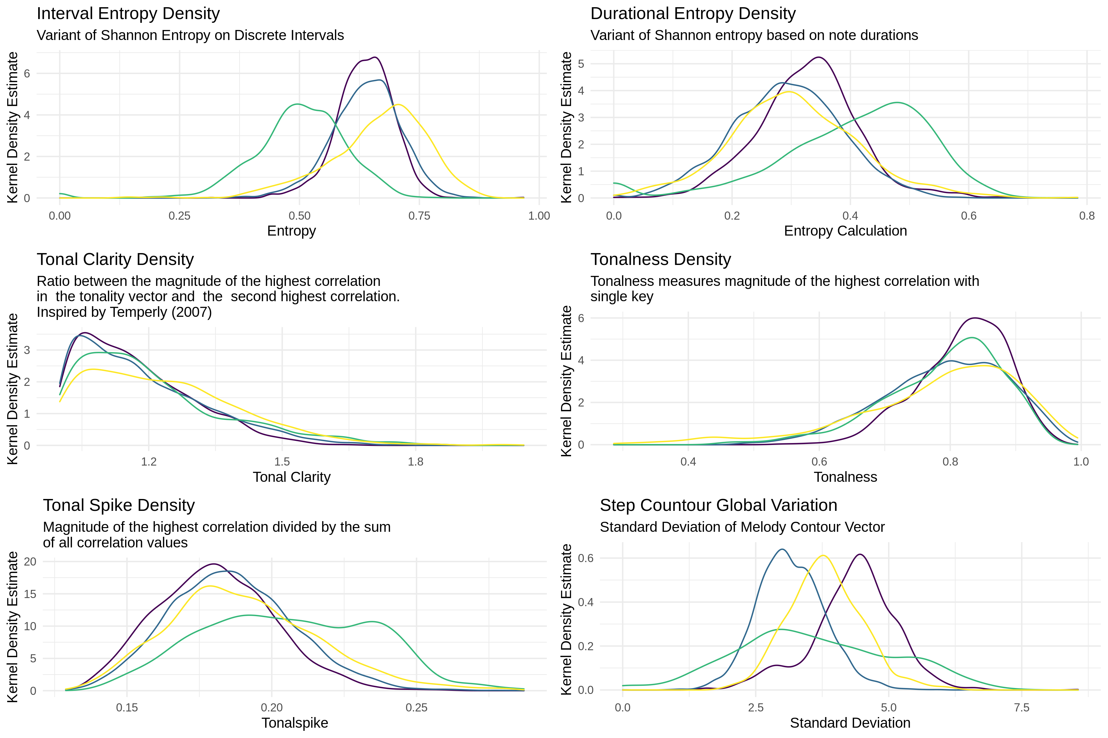 Figure 3 moves from data derived from count features of analyzable tokens to instead compute various summary statistics features derived from the FANTASTIC toolbox (Müllensiefen, 2009). The FANTASTIC toolbox, an acronym for Feature ANalysis Technology Accessing STatistics (In a Corpus), is a computational implementation of summary features of melodies inspired by work in computational linguistics, music theory, and music psychology. Brief descriptions of each feature are provided in the captions of the figures. For a complete description of each of the features, interested readers should consult the FANTASTIC documentation, but I note that all of the FANTASTIC computations for the MeloSol, Essen, and Densmore are found in the MeloSol repository for reproducible and future research.