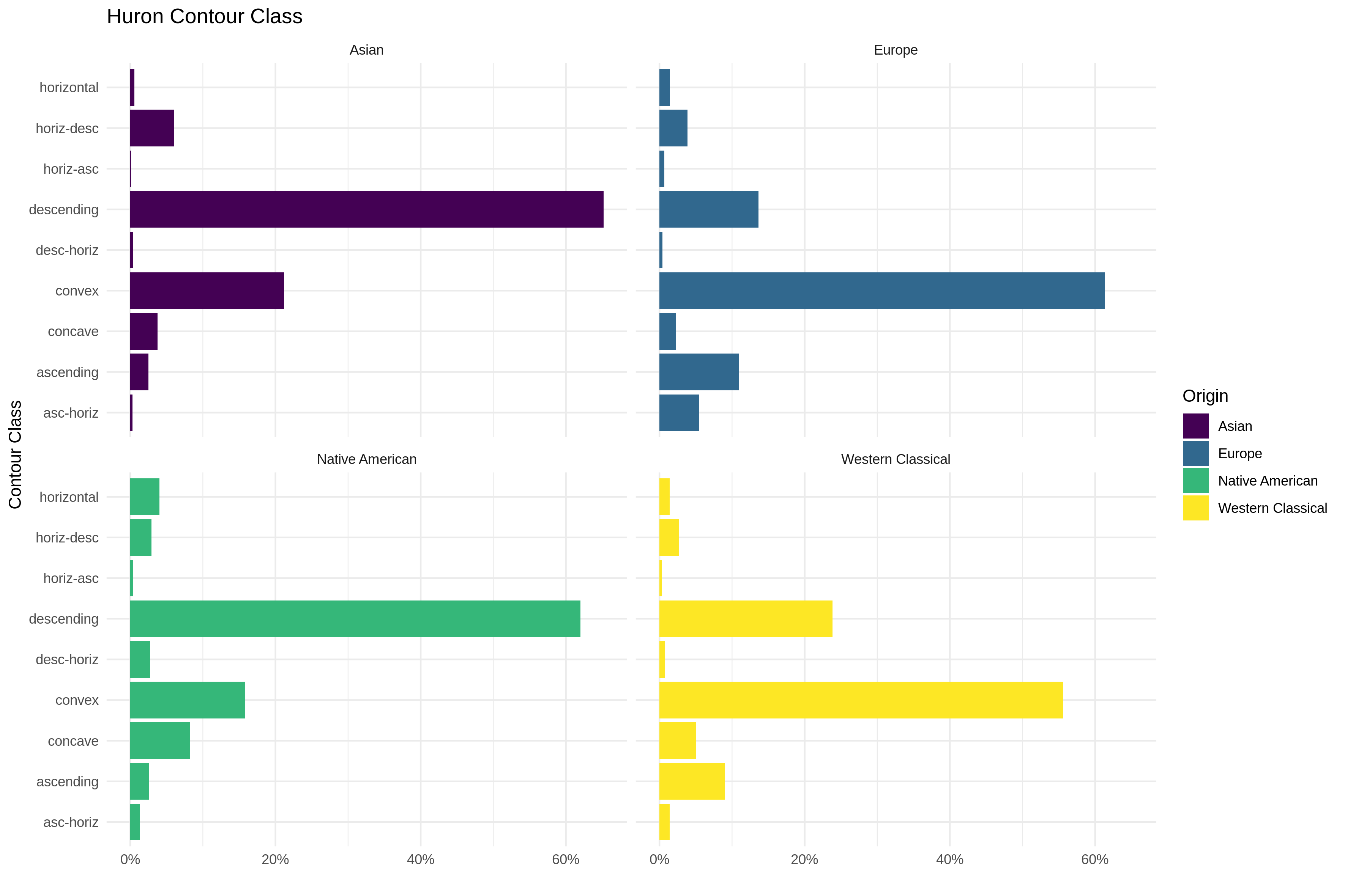 Fig. 4. Huron contour class comparison. Yellow = MeloSol corpus, blue= European subset of the Essen Folk Song Collection, purple = Asian subset of the Essen Folk Song Collection, green = The Densmore Collection of Native American Songs