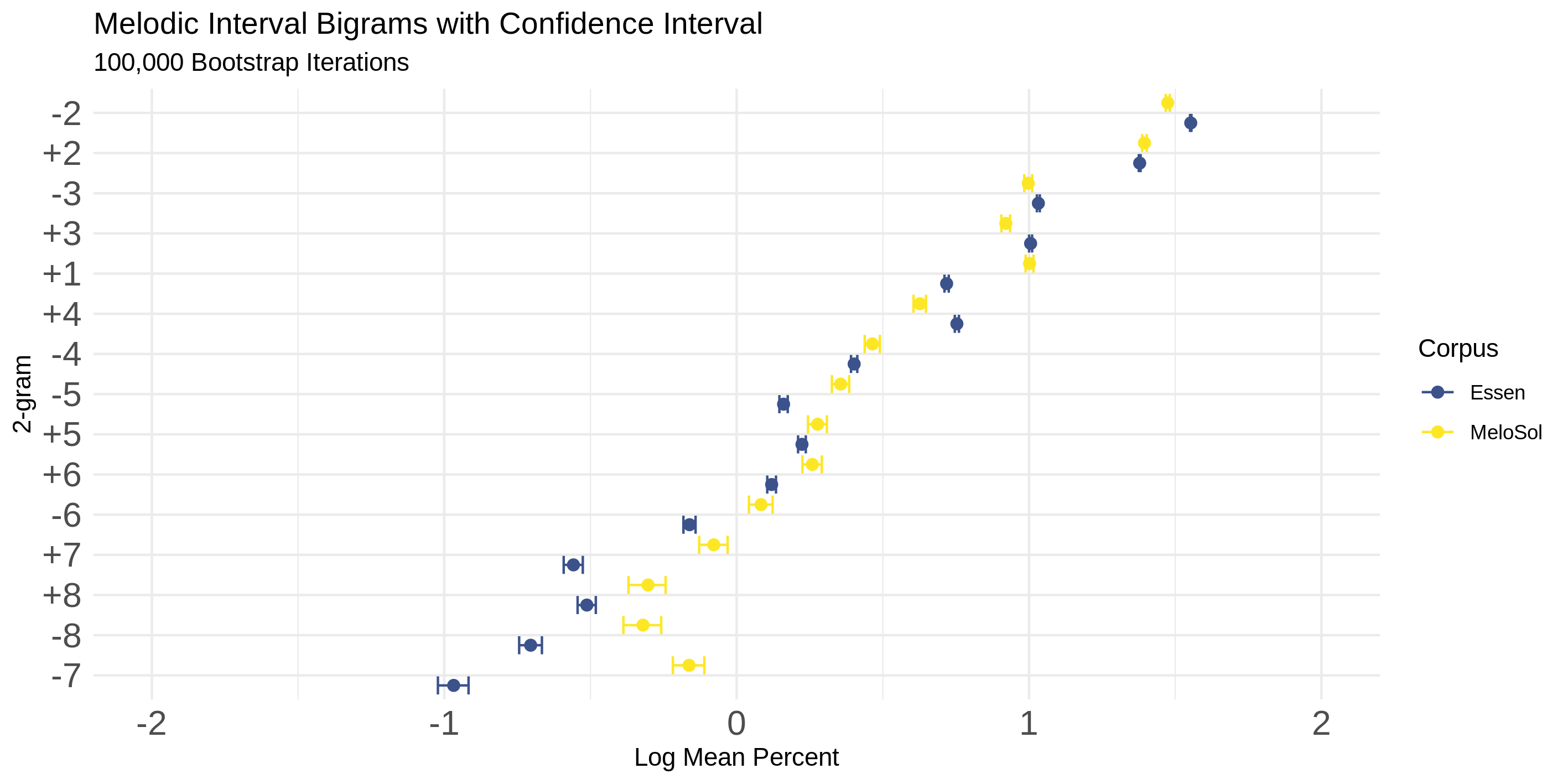 The intervals of both the Essen and MeloSol corpora are presented with bootstrap confidence intervals (R = 100,000) for each proportion parameter. Said another way, Figure 5 demonstrates that the interval patterns in the corpora share very similar properties in terms of how frequently they occur. In interpreting this figure, if each interval from each corpus appeared with the same relative frequency, the pairings would match exactly. The presentation of intervals is arranged so that more frequently occurring intervals appear higher in the visualization. The horizontal axes represent the base 10 logarithm of the percentage of that bigram of all the bigrams in the corpus.
